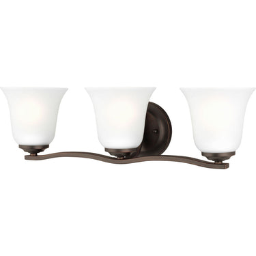The Emmons three light vanity fixture in bronze provides abundant light for your bath vanity, while adding a layer of today's style to your interior design. The Emmons lighting collection by combines form and function in a traditional empire silhouette. Trumpeted Satin Etched glass shades and a circular finial further enhance the design. Cluster three sizes together in a multi-fixture installation to make a beautifully dramatic statement in the living room, foyer, entryway or family room. The Emmons collection comes in two finishes: Brushed Nickel and Heirloom Bronze. Its assortment includes three-, five- and nine-light chandeliers; one-light mini pendant, three-light pendant, two-light semi-flush mount; one-light wall sconce; and two-, three- and four- light bath vanity fixtures. Incandescent and ENERGY STAR-qualified LED lamping are available; all fixtures are California Title 24 compliant.