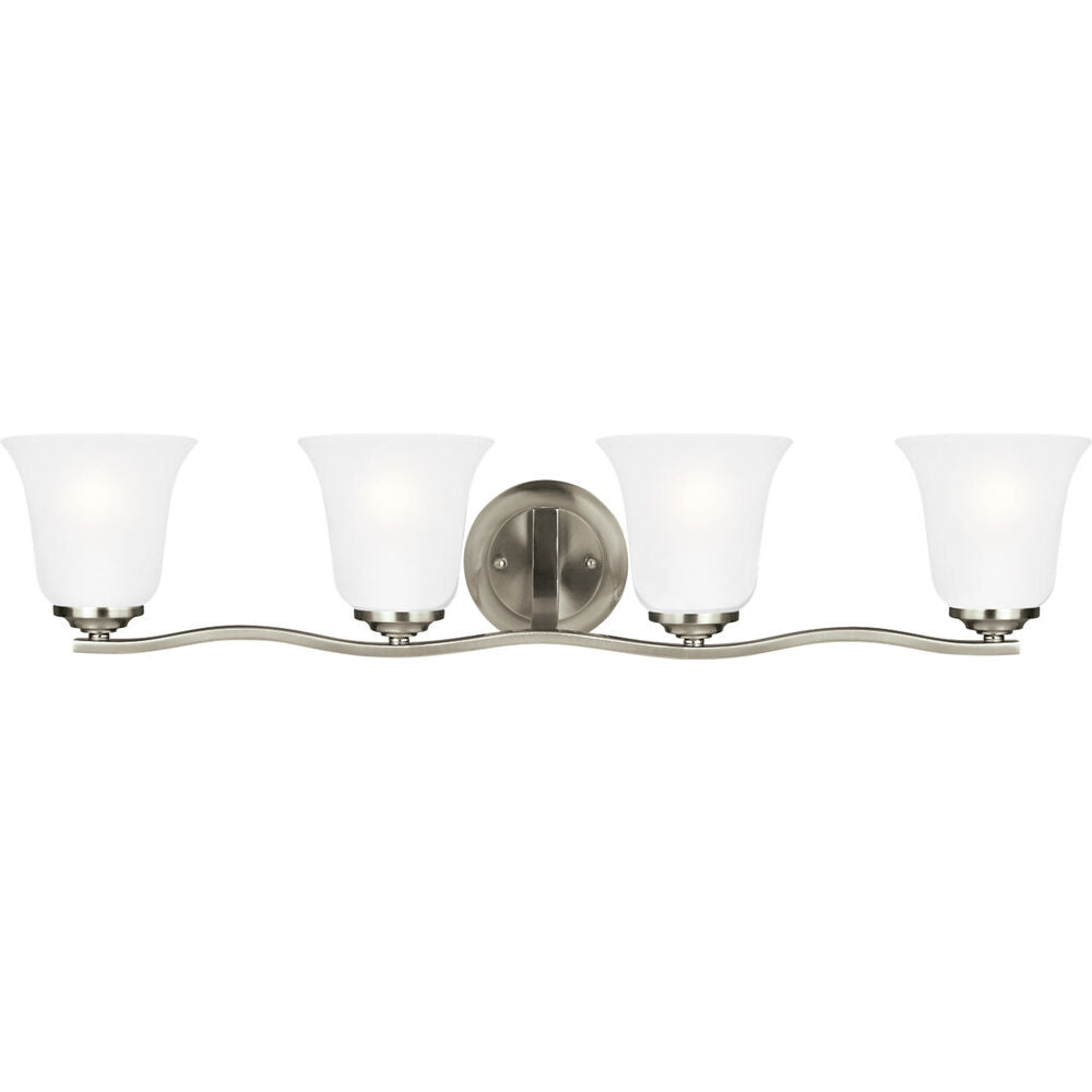 The Emmons four light vanity fixture in bronze offers shadow-free lighting in your powder room, spa, or master bath room. The Emmons lighting collection by combines form and function in a traditional empire silhouette. Trumpeted Satin Etched glass shades and a circular finial further enhance the design. Cluster three sizes together in a multi-fixture installation to make a beautifully dramatic statement in the living room, foyer, entryway or family room. The Emmons collection comes in two finishes: Brushed Nickel and Heirloom Bronze. Its assortment includes three-, five- and nine-light chandeliers; one-light mini pendant, three-light pendant, two-light semi-flush mount; one-light wall sconce; and two-, three- and four- light bath vanity fixtures. Incandescent and ENERGY STAR-qualified LED lamping are available; all fixtures are California Title 24 compliant.