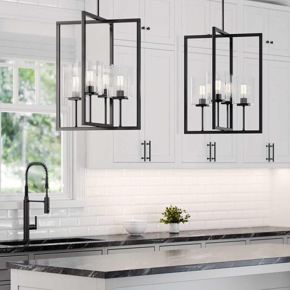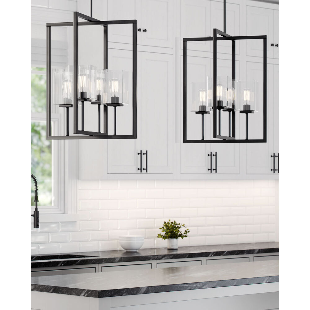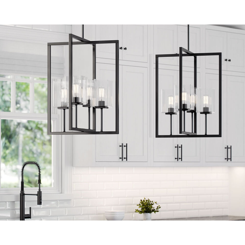 Contemporary, industrial fixture with traditional form will complement any dining room, kitchen, or foyer