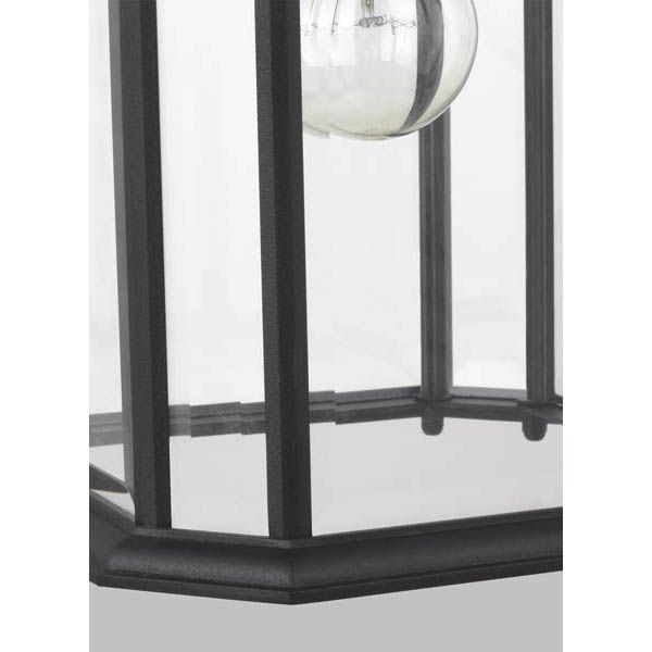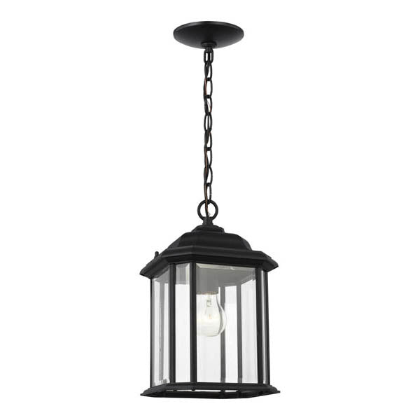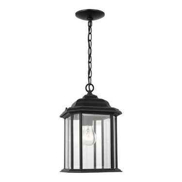 The Kent one light outdoor pendant fixture in black creates a warm and inviting welcome presentation for your home's exterior. Kent outdoor lighting fixtures by are crafted in die-cast aluminum for added durability to withstand harsh weather conditions. The traditional styling inspired by antique gas lanterns is offered in either Oxford Bronze with Clear Seeded glass, Black finish with Clear Beveled glass, and both finishes with Satin Etched glass. The assortment includes small and large one-light outdoor wall lanterns (with a flat bottom), as well as an additional design of small and large one-light outdoor wall lanterns (with finial on top and bottom) which can be mounted up or down, a one-light outdoor semi-flush convertible pendant and a one-light outdoor post lantern. Both incandescent lamping and ENERGY STAR-qualified LED lamping (for those fixtures with the Satin Etched glass) are available for most of the fixtures, and some can easily convert to LED by purchasing LED replacement lamps sold separately.