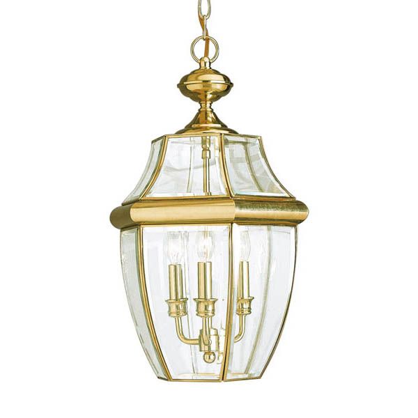 The Lancaster three light outdoor pendant fixture in polished brass creates a warm and inviting welcome, and is a classic example of traditional design. Clear curved beveled glass is paired with one of four beautiful finish options including Polished Brass, Black, Antique Bronze and Antique Brushed Nickel. The assortment includes small, medium and large one-light outdoor wall lanterns, two-light outdoor wall lantern, three-light outdoor wall lantern, two-light and three-light outdoor post lanterns and a three-light outdoor pendant. Some of the fixtures can easily convert to LED by purchasing LED replacement lamps sold separately.
