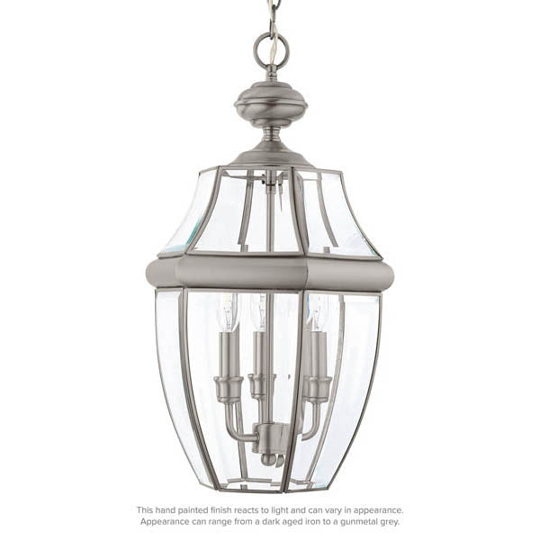 The Lancaster three light outdoor pendant fixture creates a warm and inviting welcome, and is a classic example of traditional design. Clear curved beveled glass is paired with one of four beautiful finish options including Polished Brass, Black, Antique Bronze and Antique Brushed Nickel. The assortment includes small, medium and large one-light outdoor wall lanterns, two-light outdoor wall lantern, three-light outdoor wall lantern, two-light and three-light outdoor post lanterns and a three-light outdoor pendant. Some of the fixtures can easily convert to LED by purchasing LED replacement lamps sold separately.