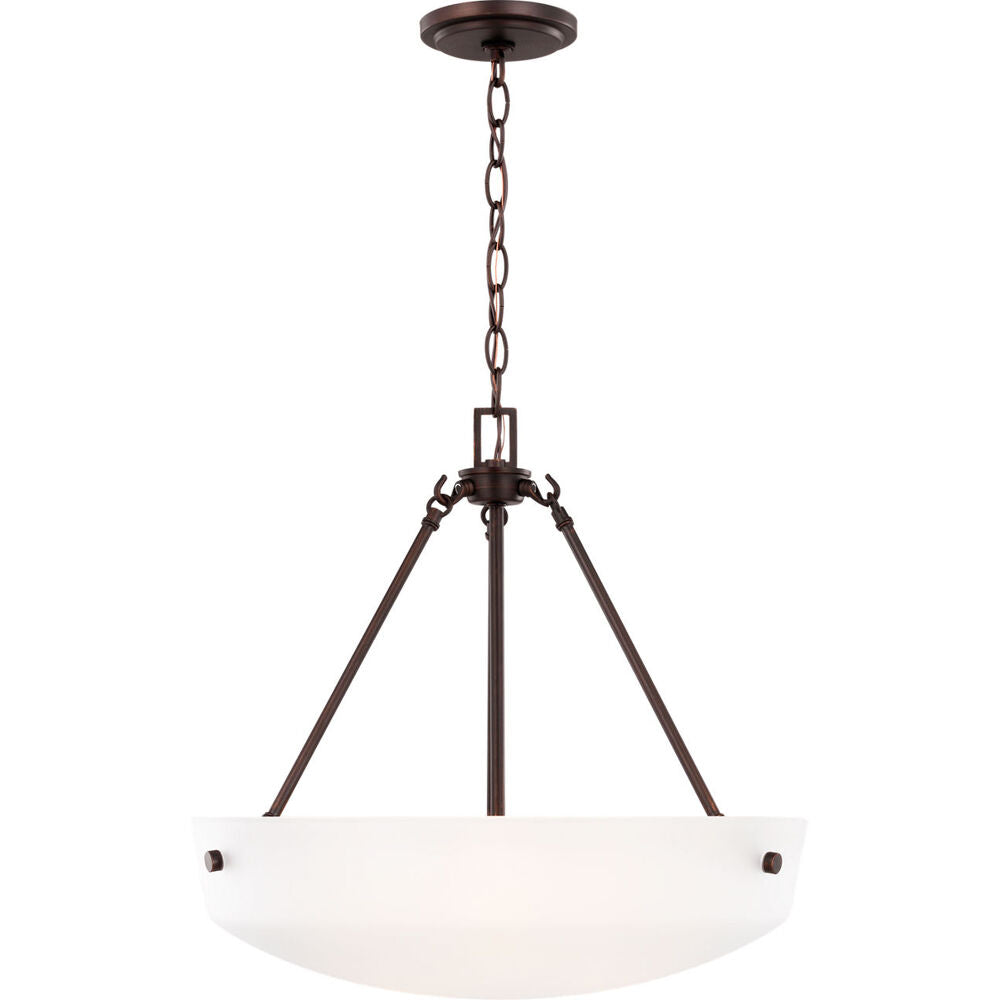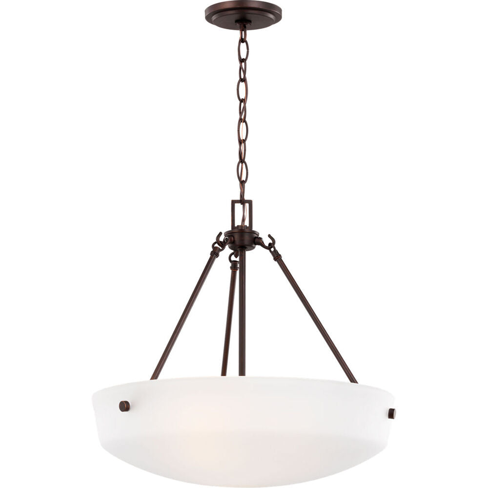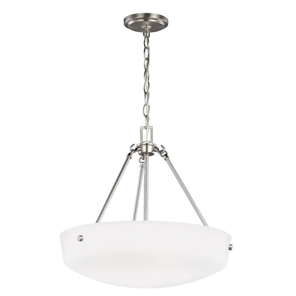 The Kerrville three light indoor pendant provides abundant light to your home, while adding style and interest. With a simple, airy appearance, the Kerrville lighting collection by embraces its modern design roots while enhancing virtually any homes decor. Tubular steel arms extend outward and curve to present beautiful tapered, Satin Etched glass shades. The collection has a Brushed Nickel, Burnt Sienna or Chrome finish and offers three-, five- and nine-light chandeliers, a one-light mini pendant, one- and three-light pendants, a two-light semi-flush mount which can convert to a pendant, and one-, two-, three- and four-light bath fixtures. Incandescent and ENERGY STAR-qualified LED lamping are available; all fixtures are California Title 24 compliant.