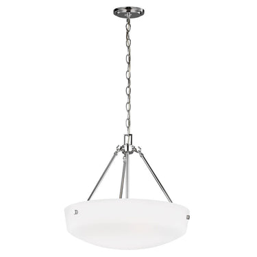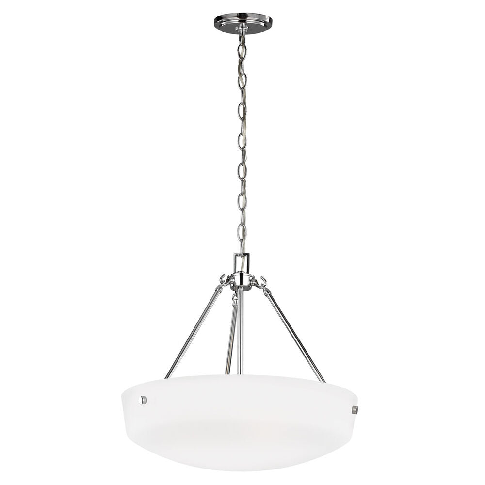 The Kerrville three light indoor pendant in chrome provides abundant light to your home, while adding style and interest. With a simple, airy appearance, the Kerrville lighting collection by embraces its modern design roots while enhancing virtually any homes decor. Tubular steel arms extend outward and curve to present beautiful tapered, Satin Etched glass shades. The collection has a Brushed Nickel, Burnt Sienna or Chrome finish and offers three-, five- and nine-light chandeliers, a one-light mini pendant, one- and three-light pendants, a two-light semi-flush mount which can convert to a pendant, and one-, two-, three- and four-light bath fixtures. Incandescent and ENERGY STAR-qualified LED lamping are available; all fixtures are California Title 24 compliant.