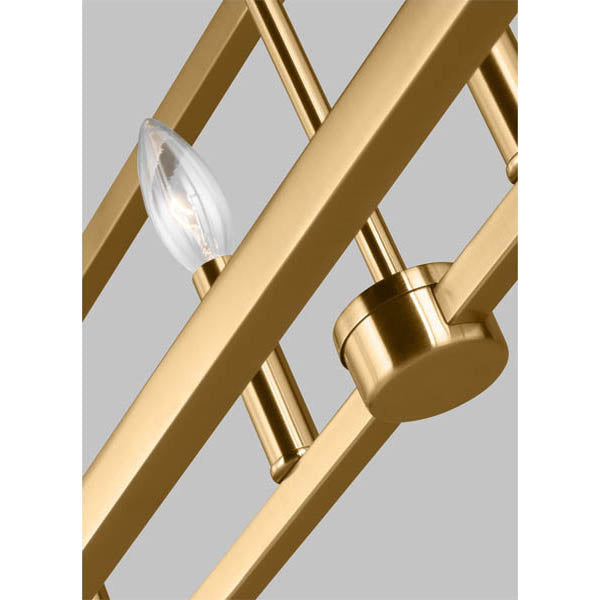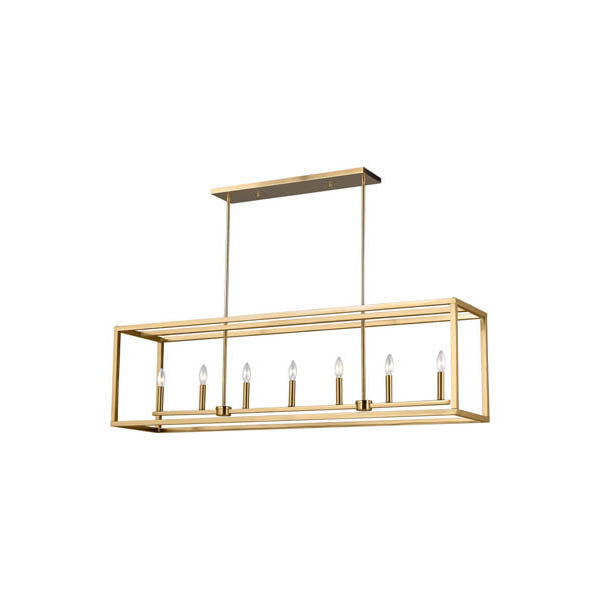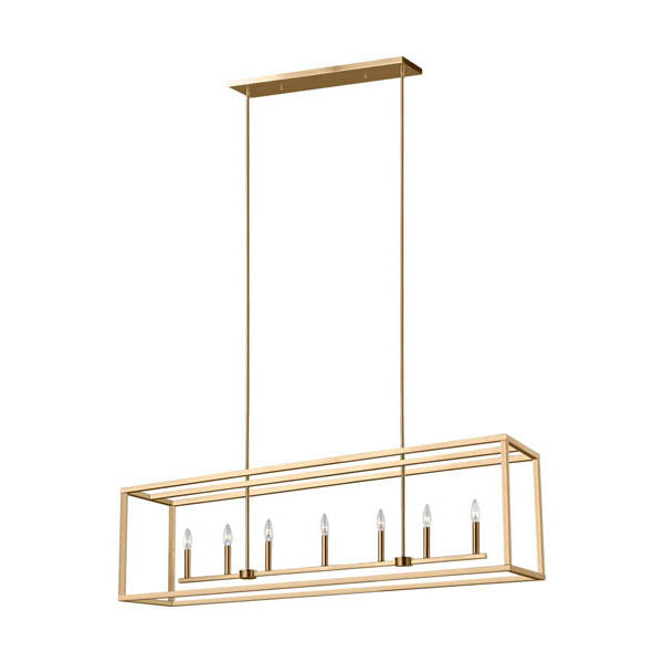 The Moffet Street seven light linear chandelier in bronze is the perfect way to achieve your desired fashion or functional needs in your home. The Moffet Street series offers a distinctive take on a rustic theme. Built in broad steel frames with hand-applied finish that mimics natural wood. This combination of rustic and urban fits comfortably in a wide variety of environments. The sharp, squared lines of the frame complement a wide variety of settings. The collection includes eight-light foyer, four-light foyer, one- light wall sconce, and a six-light island fixture. The Moffet Street series is available in three beautiful finishes Washed Pine, Brushed Nickel and Satin Bronze All fixtures are California Title 24 compliant and damp rated for use in sheltered, damp environments.