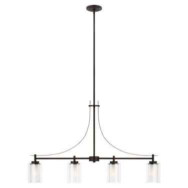The Elmwood Park four light linear chandelier in bronze enhances the beauty of your home with ample light and style to match today's trends. Elmwood Park by has clear glass tube shades with an inner white glass element that softens the light and helps cast an even glow. A cylinder of etched glass is centered within a larger cylinder of clear glass which encircles each light bulb to create this stunning visual effect. The full assortment includes three-, five-and nine-light chandeliers, a four-light linear, one-light mini pendant, a three-light pendant, a two-light semi flush which is convertible into a pendant, and one-, two-, three- and four-light bath fixtures. All fixtures offered in either a Brushed Nickel or Brushed Oil Rubbed Bronze. Incandescent and ENERGY STAR-qualified LED lamping are available; all fixtures are California Title 24 compliant.