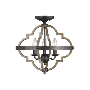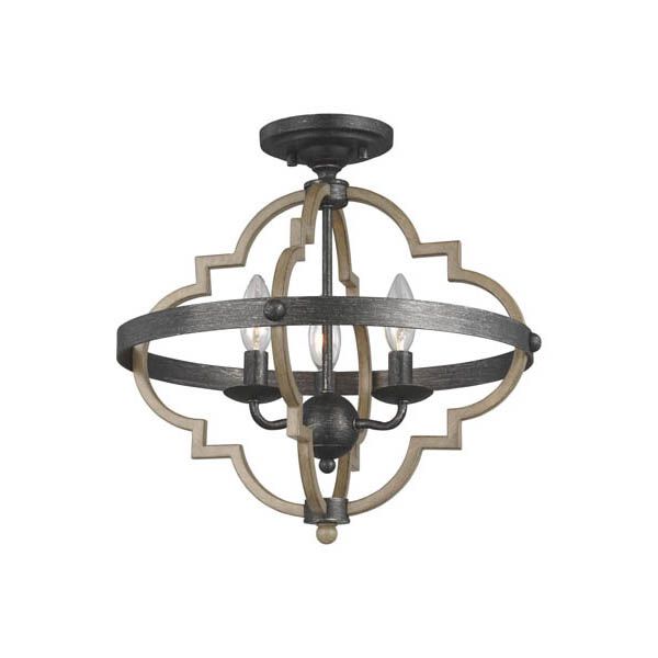 The Socorro three light semi flush fixture in stardust supplies ample lighting for your daily needs, while adding a layer of today's style to your home's decor. The transitional Socorro lighting series by features a classic, barbed Quatrefoil profile - wholly updated by combining a distressed Cerused Oak finish on the decorative silhouette with the rich Stardust finish on the metal bobeches and decorative strapping to create undeniable rustic charm. While still offered in its original finish Stardust, the Socorro has been beautifully updated with our popular Washed Pine and Chrome finish to offer a modern take on this timeless industrial beauty. The collection includes a four-light mini-chandelier, medium and large six-light chandeliers, and four-light and six-light hall / foyer pendants. Incandescent candelabra base lamping.