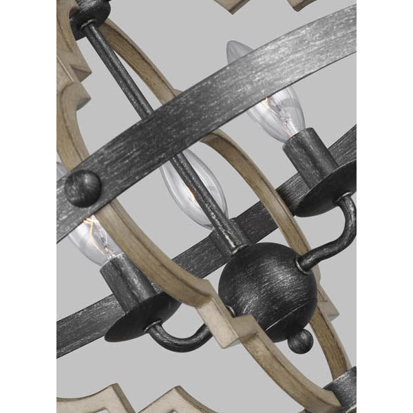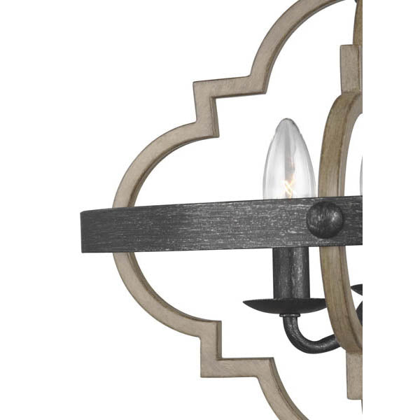 The transitional Socorro lighting series features a classic, barbed Quatrefoil profile - wholly updated by combining a distressed Cerused Oak finish on the decorative silhouette with the rich Stardust finish on the metal bobeches and decorative strapping to create undeniable rustic charm.