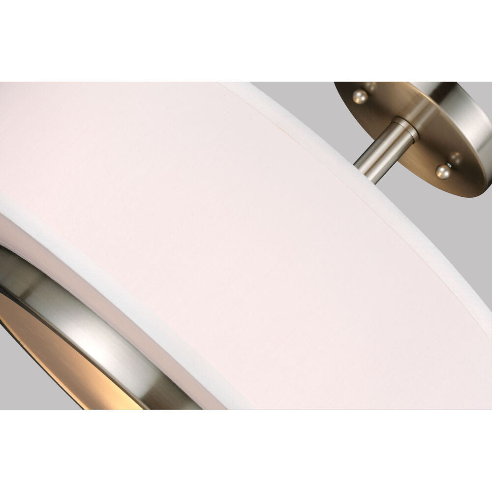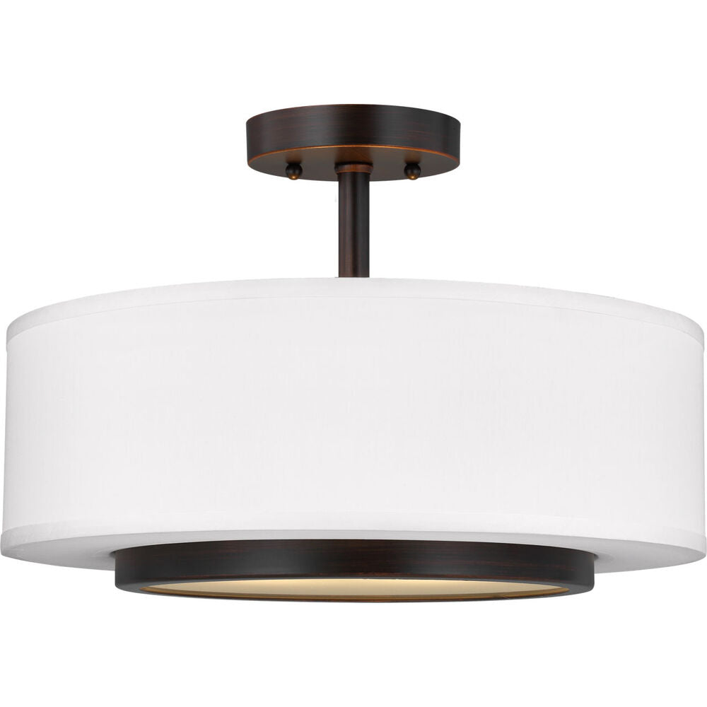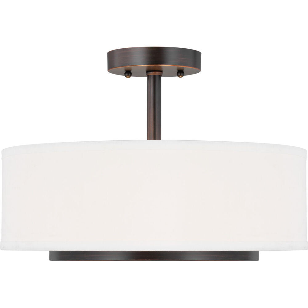 The Nance two light indoor semi-flush convertible in bronze enhances the beauty of your home with ample light and style to match today's trends. The mid-century inspired Nance lighting collection by is a versatile transitional design which fits in a wide array of traditional or contemporary settings. The tapered, off-white, faux silk shades add warmth and sophistication. The large pendant and semi-flush faux silk drum shades are complemented nicely with Satin Etched Opal glass diffusers to soften the downlight. In either of the available Brushed Nickel or Heirloom Bronze finishes, all the Nance fixtures are timeless additions to any foyer, kitchen or dining area. The assortment includes three- five- and nine-light chandeliers; a one-light wall sconce; two- and three-light bath vanities and a two-light semi-flush convertible drum pendant. Incandescent and ENERGY STAR-qualified LED lamping are available; all fixtures are California Title 24 compliant.