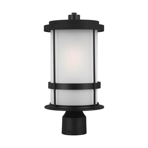 Wilburn modern 1-light outdoor exterior post lantern in black finish with satin etched glass shade