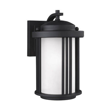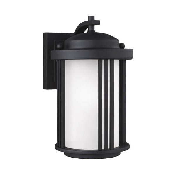 The Crowell one light outdoor wall fixture in black enhances the beauty of your property, makes your home safer and more secure, and increases the number of pleasurable hours you spend outdoors. The transitional Crowell outdoor lighting collection by conveys Art Deco influences with its linear, vertical details and clean, overall design. Their large scale gives these light fixtures real presence without competing with the residential architecture they adorn. The lighting collection, offered in Antique Bronze finish with Creme Parchment glass or Black finish with Satin Etched glass, offers a one-light outdoor pendant, a two-light outdoor ceiling flush mount, a one-light outdoor post lantern, and small, medium and large one-light outdoor wall lanterns also available in Dark Sky versions. Incandescent, integrated LED and ENERGY STAR-qualified LED lamping are available. The advanced, integrated LED option has warm-on-dim technology that warms in color when dimmed, going from 2700K to 2200K and is California Title 24 compliant.