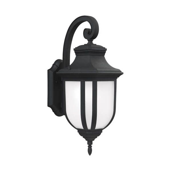 The Childress one light outdoor wall fixture in black creates a warm and inviting welcome presentation for your home's exterior. The stately Childress outdoor lighting collection by is rich with design elements contributing to its traditional silhouette. A shepherds crook, chamfered roof line, cut-corner-square body with Satin Etched glass and a small bottom finial all add detail and visual interest. Made of durable cast aluminum, a stepped-edge backplate completes the traditional look. Offered in Antique Bronze or Black finish, the lighting fixtures include a two-light outdoor ceiling flush mount, an extra-large two-light outdoor wall lantern, small, medium and large one-light outdoor wall lanterns, a one-light outdoor pendant; and a one-light outdoor post lantern. Incandescent, integrated LED and ENERGY STAR-qualified LED lamping are available. The advanced, integrated LED option has warm-on-dim technology that warms in color when dimmed, going from 2700K to 2200K and is California Title 24 compliant.