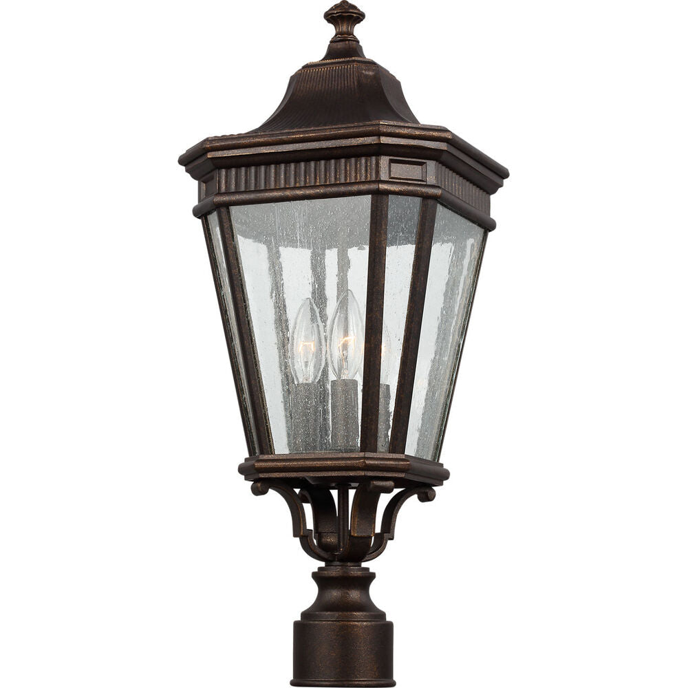 The traditional, antique gas lantern-inspired design of Cotswold Lane features dentil molding at the top of each pane of beveled glass.