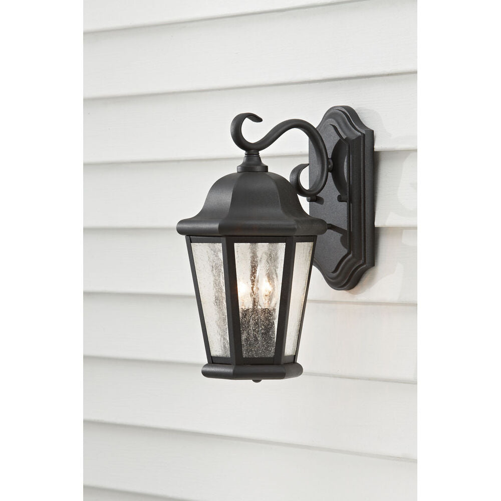 Martinsville traditional 2-light outdoor exterior medium wall lantern sconce in black finish with clear seeded glass shades