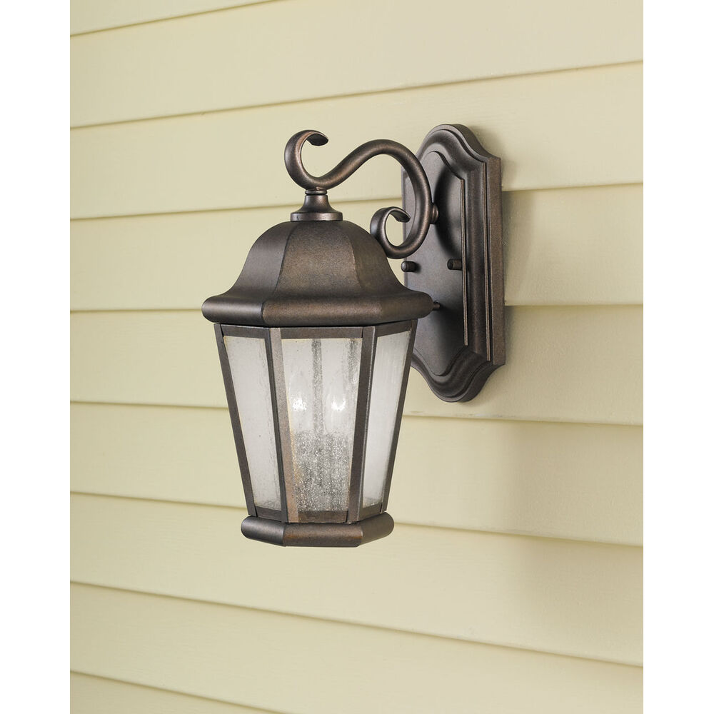 The Martinsville two light outdoor wall fixture enhances the beauty of your property, makes your home safer and more secure, and increases the number of pleasurable hours you spend outdoors. Taking a design cue from the Victorian Era, our Martinsville outdoor lighting have a durable, die-cast aluminum, hexagonal frame with clear seeded glass panels that beautifully reflect the light. These durable and timeless fixtures are available in either a Corinthian Bronze or Black finish.