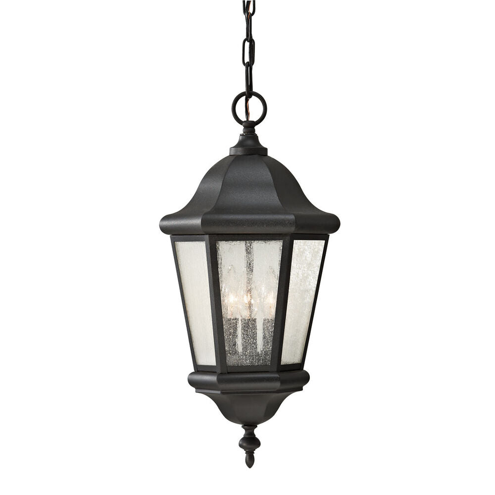 The Martinsville three light outdoor pendant fixture in black enhances the beauty of your property, makes your home safer and more secure, and increases the number of pleasurable hours you spend outdoors. Taking a design cue from the Victorian Era, our Martinsville outdoor lighting have a durable, die-cast aluminum, hexagonal frame with clear seeded glass panels that beautifully reflect the light. These durable and timeless fixtures are available in either a Corinthian Bronze or Black finish.