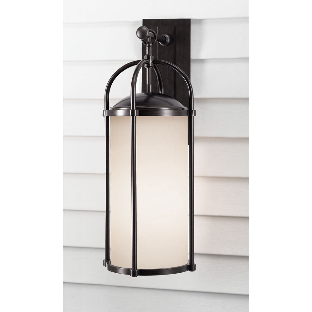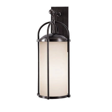 The Dakota one light outdoor wall fixture in espresso creates a warm and inviting welcome presentation for your home's exterior. The Dakota Collection is a contemporary take on a traditional lantern that is elegantly suspended from the backplate. The delicate lines on Dakota's streamlined frame rise softly into a curved crown. Dakota is available in an Espresso finish with a choice of either an Opal Etched glass shade or a Clear Seeded glass shade.