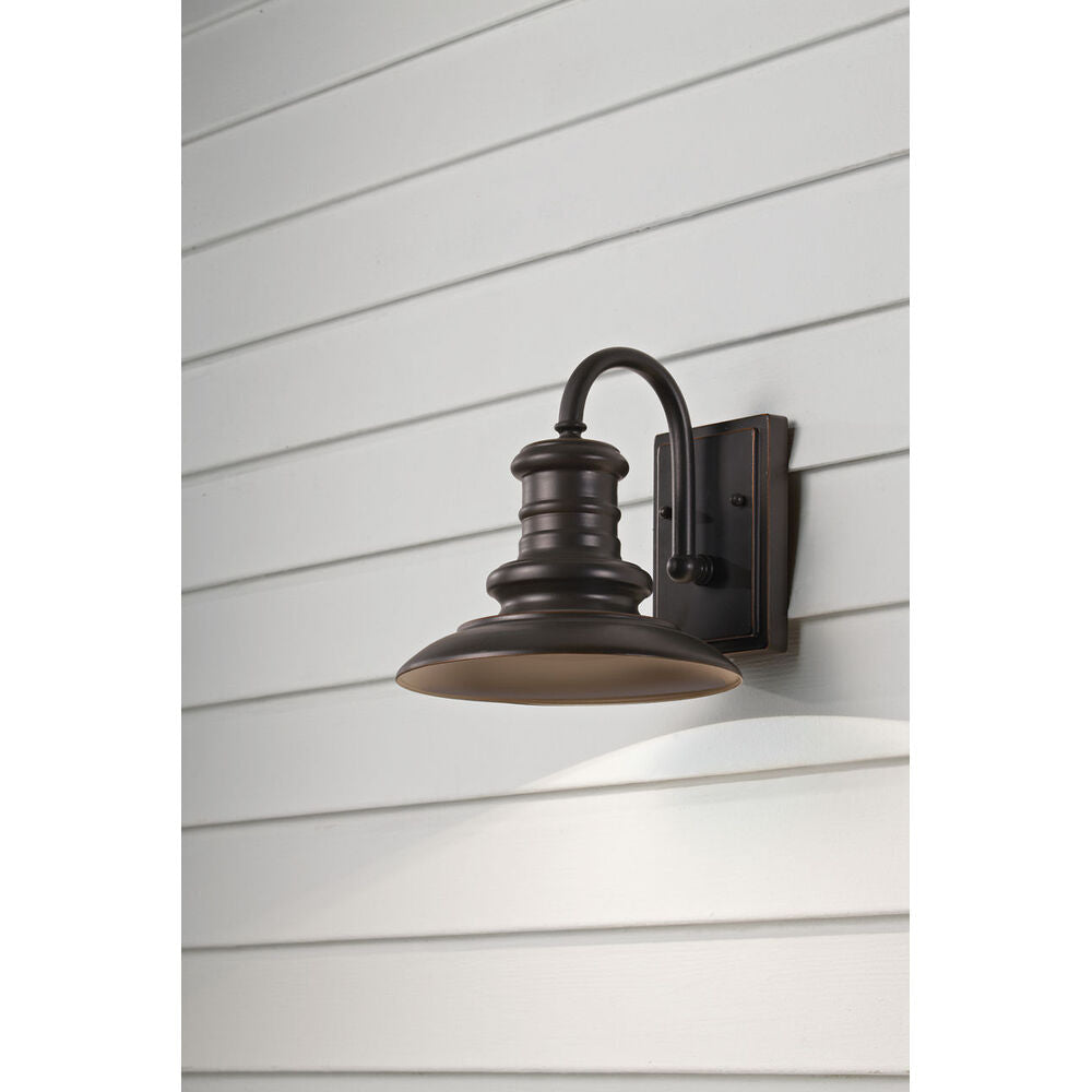 The Redding Station one light outdoor wall fixture in restoration bronze enhances the beauty of your property, makes your home safer and more secure, and increases the number of pleasurable hours you spend outdoors. All Aboard! Reminiscent of old railroad lighting, the Redding Station Collection warmly illuminates its surroundings with a vintage railroad vibe. The all-aluminum shades feature textured details. Redding Station is available in three finish options: Tarnished Silver, Restoration Bronze and Textured Black.