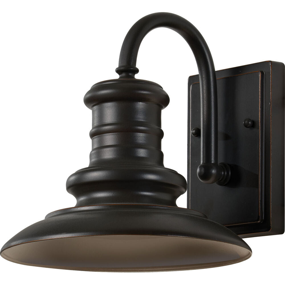 The Redding Station one light outdoor wall fixture in restoration bronze creates a warm and inviting welcome presentation for your home's exterior. All Aboard! Reminiscent of old railroad lighting, the Redding Station Collection warmly illuminates its surroundings with a vintage railroad vibe. The all-aluminum shades feature textured details. Redding Station is available in three finish options: Tarnished Silver, Restoration Bronze and Textured Black.