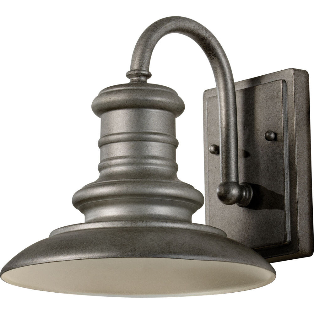 The Redding Station one light outdoor wall fixture creates a warm and inviting welcome presentation for your home's exterior. All Aboard! Reminiscent of old railroad lighting, the Redding Station Collection warmly illuminates its surroundings with a vintage railroad vibe. The all-aluminum shades feature textured details. Redding Station is available in three finish options: Tarnished Silver, Restoration Bronze and Textured Black.