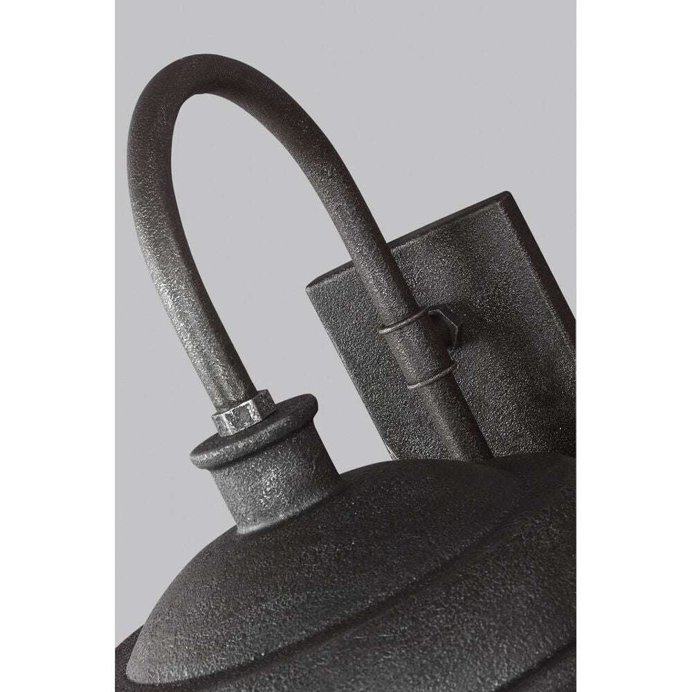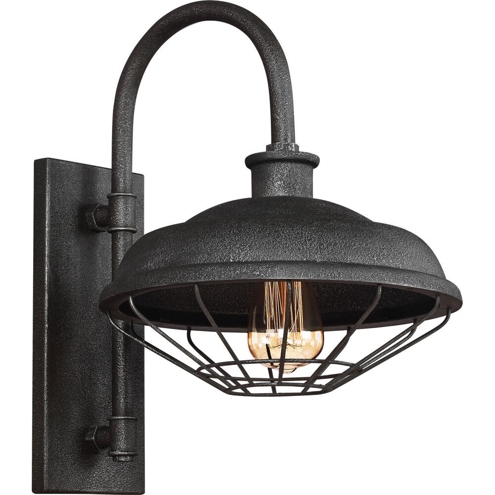 The Lennex one light outdoor wall fixture in slate grey metal creates a warm and inviting welcome presentation for your home's exterior. The Lennex collection by is a throwback to the Industrial Revolution, featuring open metal cages, exposed lamping and gooseneck detailing that resemble true vintage warehouse fixtures. Real gas piping secures the pitted, rugged sand-cast shades, which are produced in a new Slated Grey Metal finish. Designers are selecting this industrial look to complement a wide array of decor from traditional spaces to urban loft to chic, European-inspired eclectic rooms. The indoor/outdoor wall sconces are a sharp architectural accent whether flanking a front door, garage or pool house