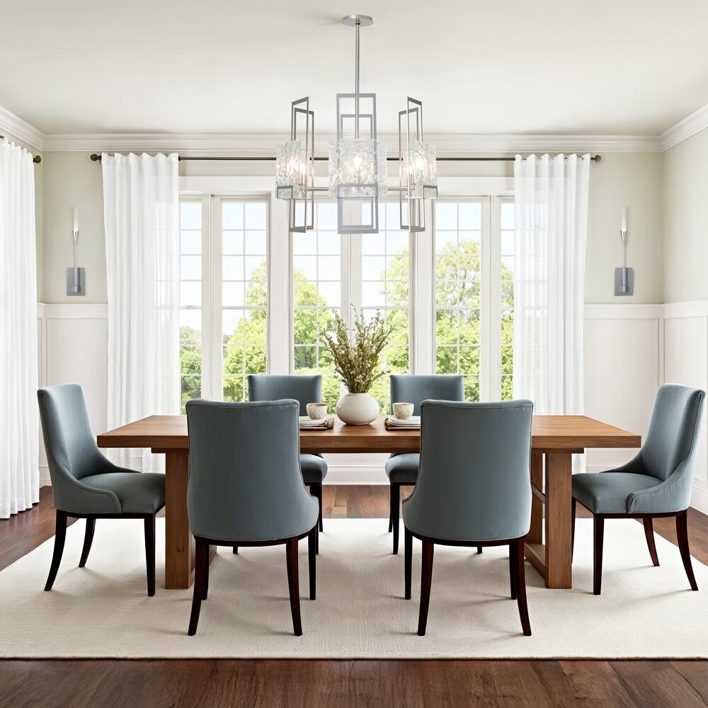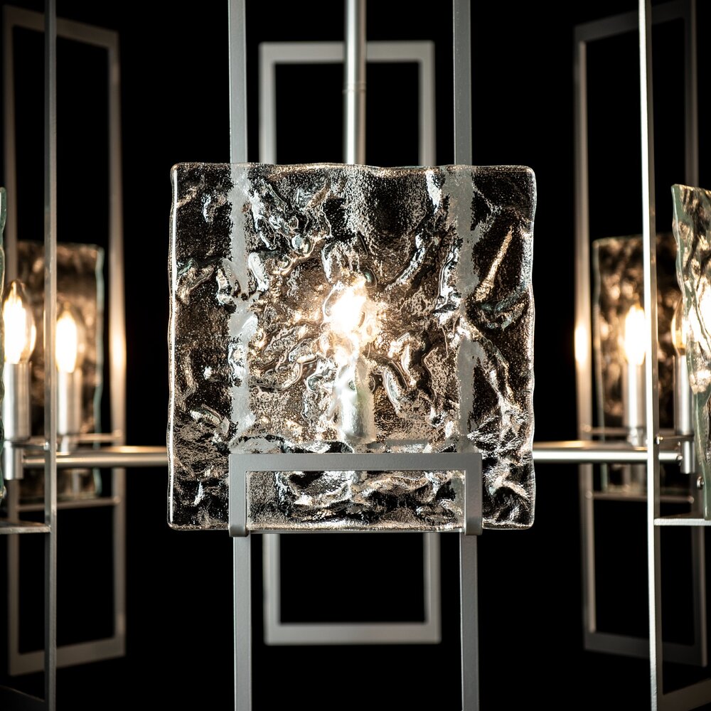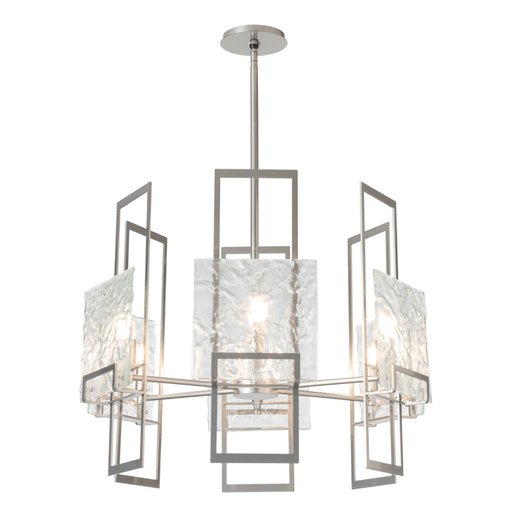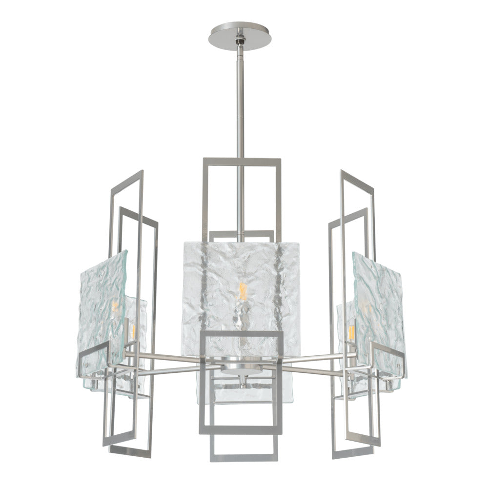 A juxtaposition of unique textured clear glass elements with tall vertical modern steel structures achieved the clean, contemporary lines that designer Ori Goldberg was seeking. The Geo 6-Light Pendant is perfect either alone or in multiples, making it easily adaptable to many spaces.