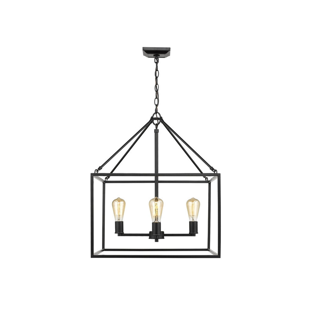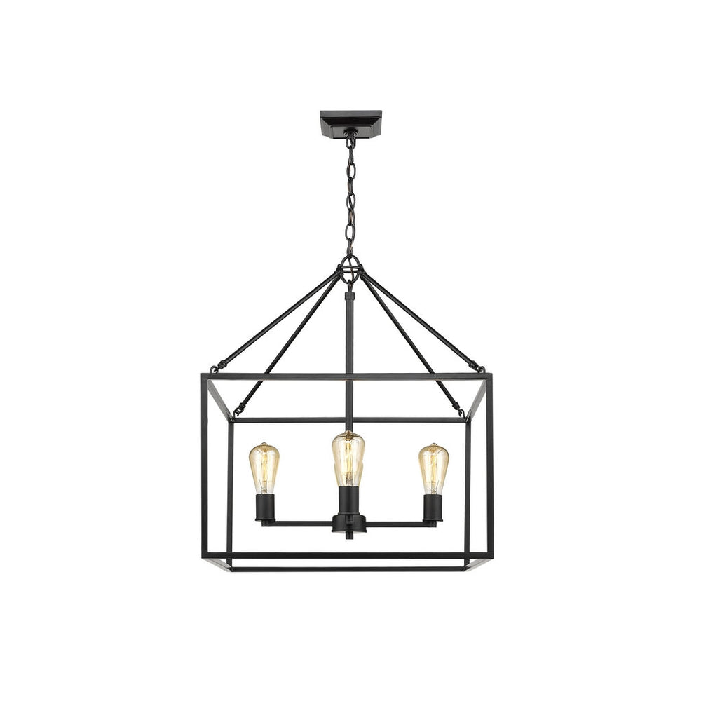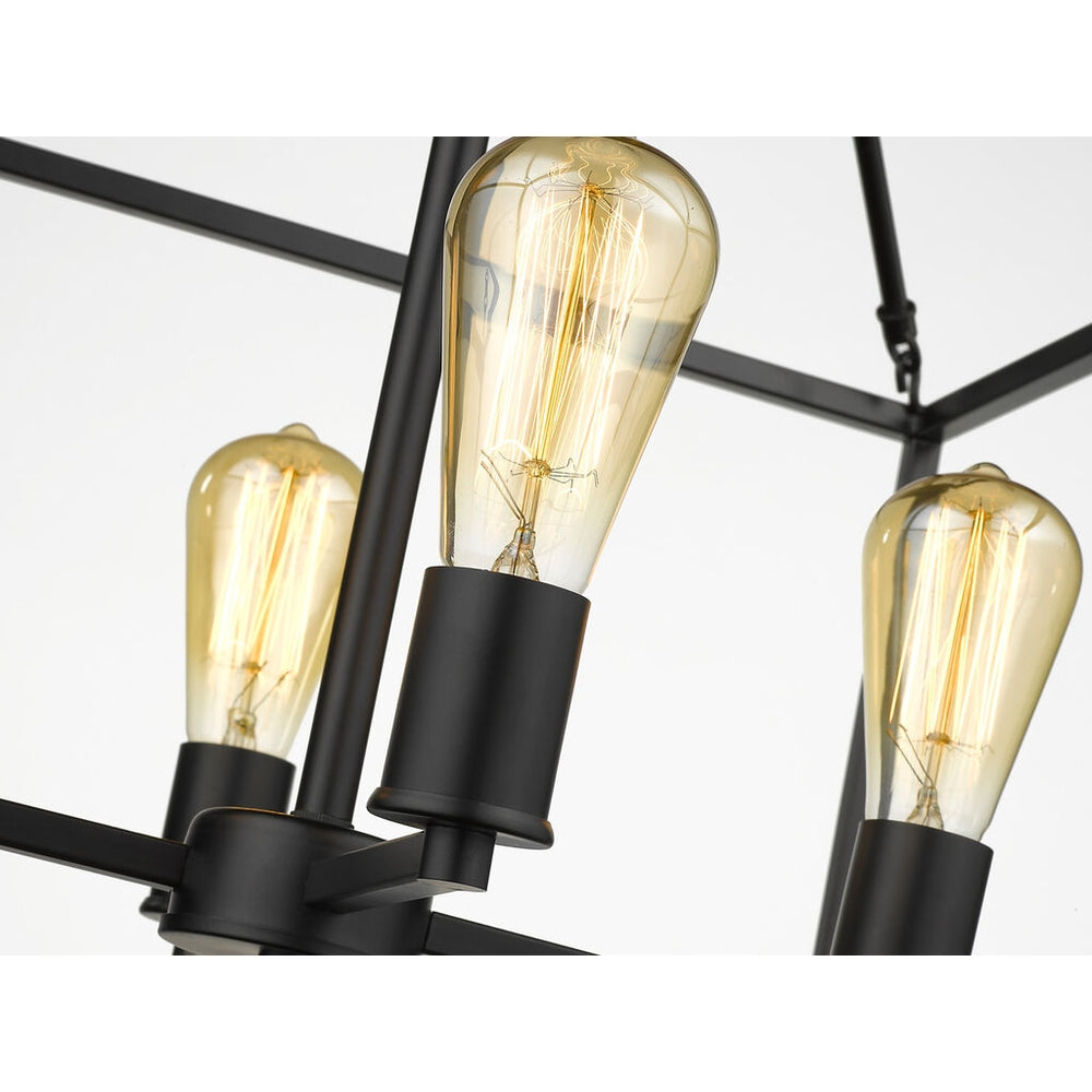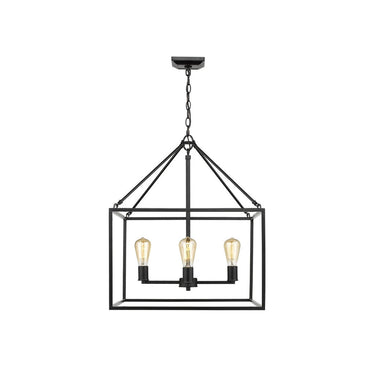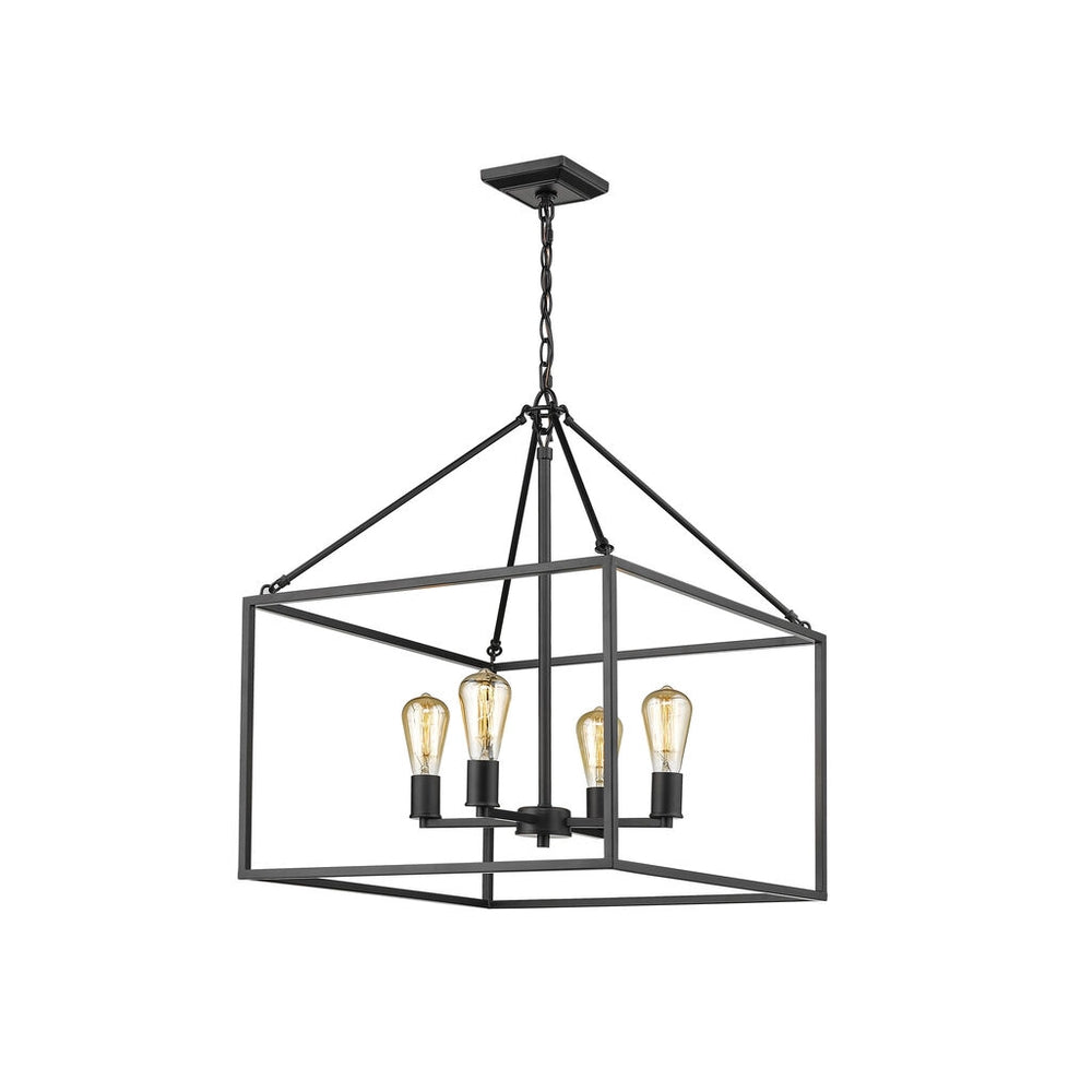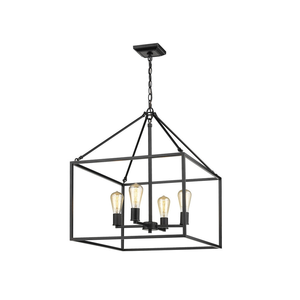 Wesson is a clean contemporary collection that is available in multiple finishes. The industrial look is enhanced by the exposed medium-based bulbs inside the square tubing of the open, geometric cages. Complete the modern, rustic look by installing Edison Bulbs. This 4-light chandelier's generous frame makes it perfect for large open spaces, while its height allows it to work comfortably in 8-9' ceilings.