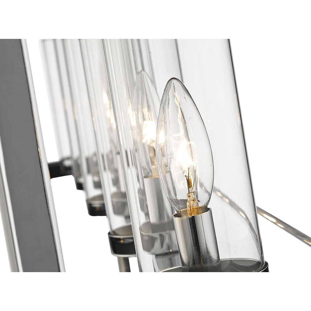 - Clear Glass cylinders encase steel candles and candelabra bulbs