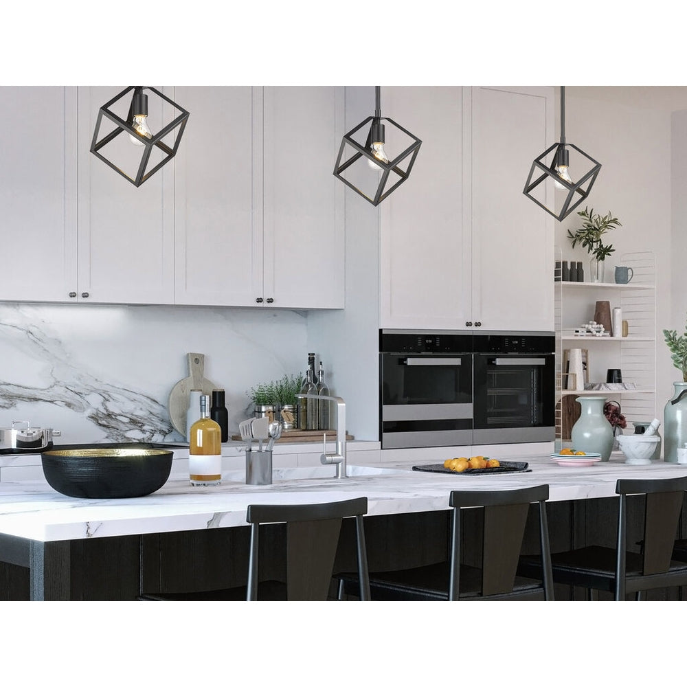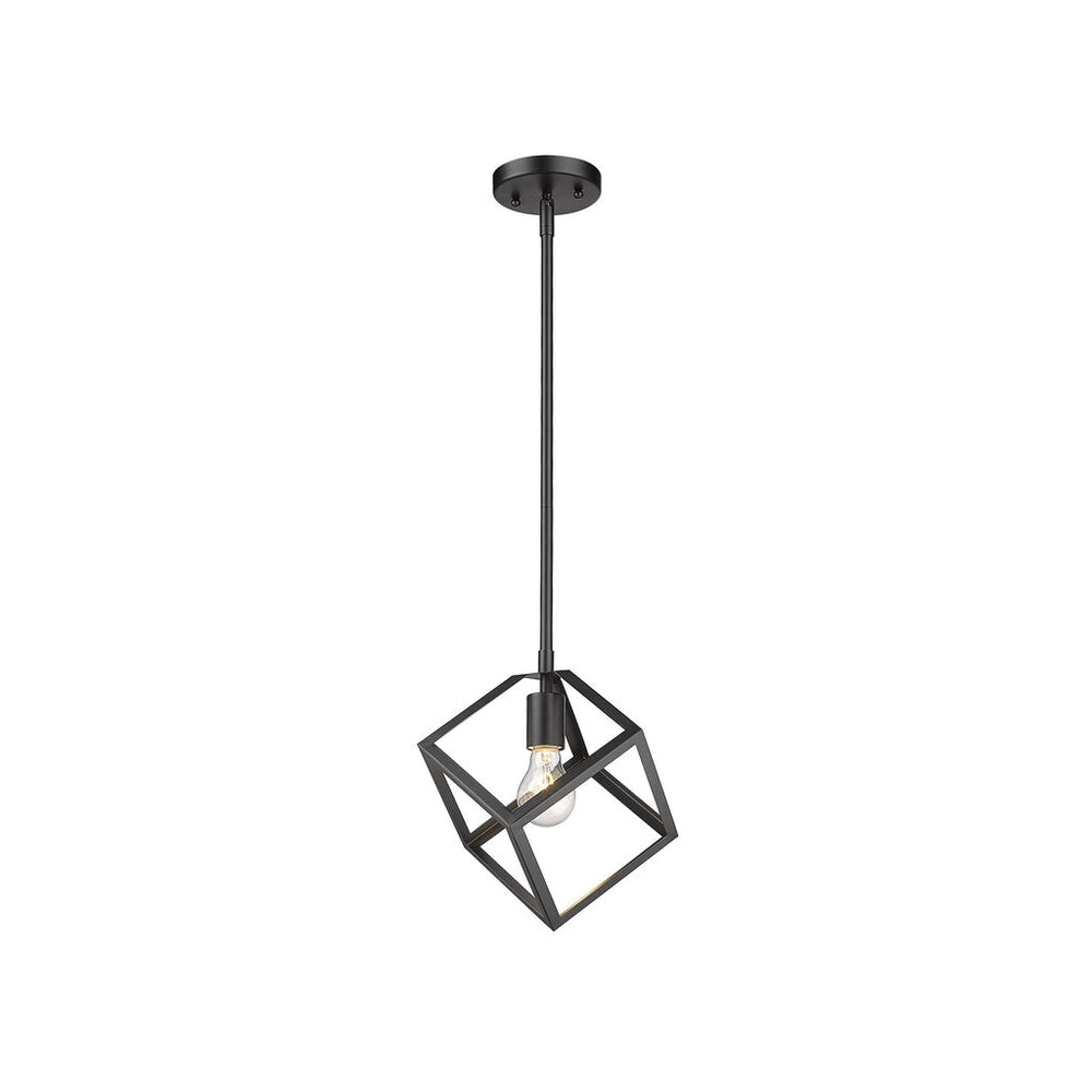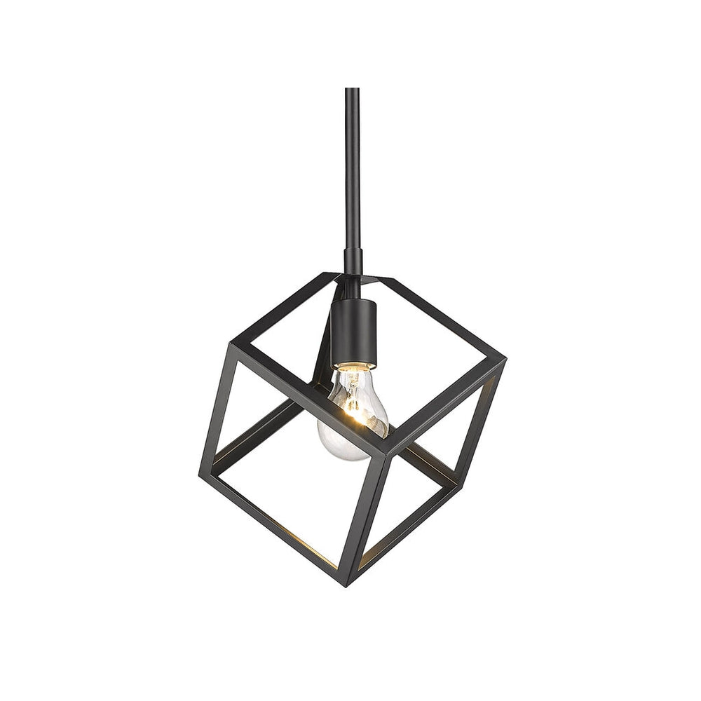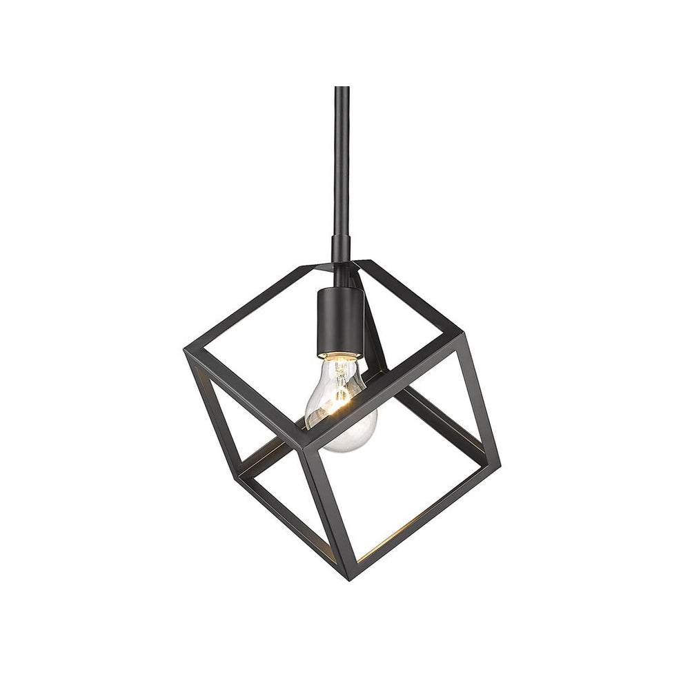 Strong, industrial lines and a unique geometric design are the basis of the Cassio series. Dramatic, double edges and bold lines make Cassio a focal point that is sure to add visual interest to any space. As if frozen in space, an exposed lamp sits within a suspended 3-dimensional cube. The open, glass-free cage lends an airy, playful tone while providing utility in the form of widespread light and easy bulb changes. Choose between trending metal finishes like Olympic Gold and Matte Black.