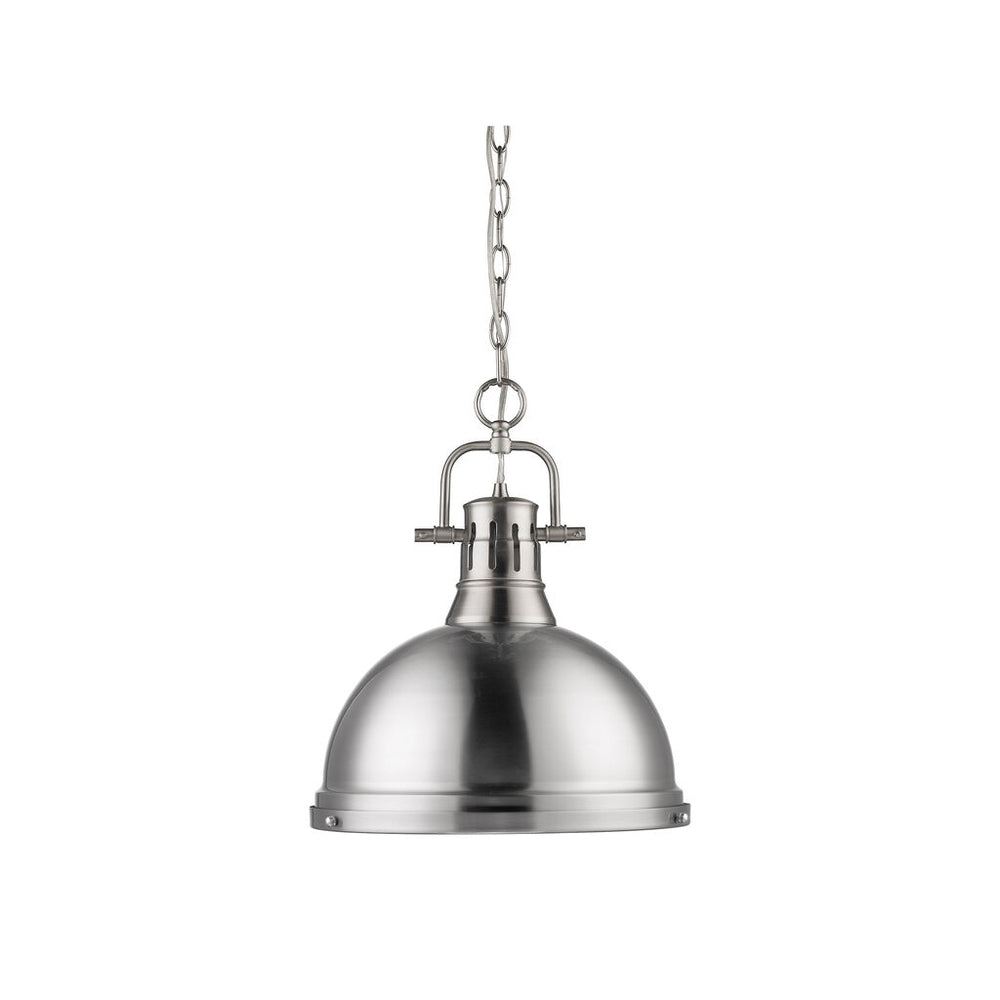 Transform the look of your room with this classic, vintage-inspired fixture by Golden Lighting. Golden Lighting's Duncan collection is contemporary style with an industrial feel. The collection features a variety of simple, traditional silhouettes that are a nod to a bygone era. A variety of plated and painted metal shade finishes are offered in combination with durable Aged Brass, Chrome or Pewter fixture bodies. Rubbed Bronze fixtures are paired with Rubbed Bronze shades. This large, chain-hung pendant features a glass diffuser and is comfortably sized for a small nook or island. The pendant may be hung individually or arrayed as a set.