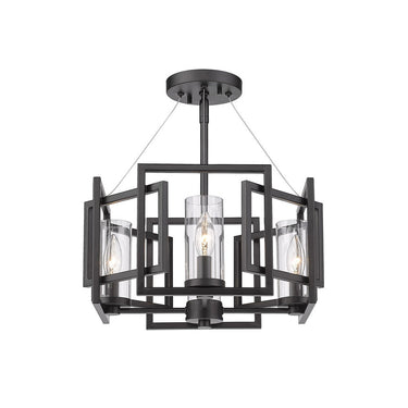 Sleek angles, pure geometry, and industrial finishes synergize to make an ultra-modern statement in Golden Lighting's Marco collection. A striking Gunmetal Bronze finish gives warm undertones to the bold square frames, while Clear Glass cylinders surround the stately silhouettes of candelabra bulbs. The Marco semi-flush serves as an open platform that provides ample light with contemporary flare.