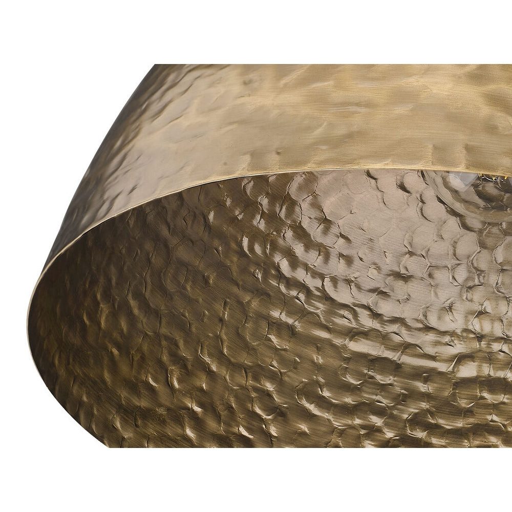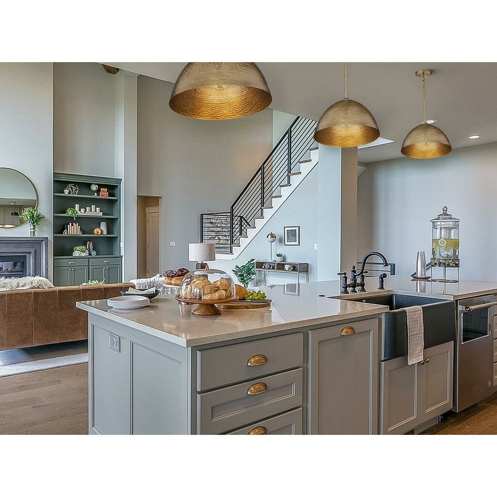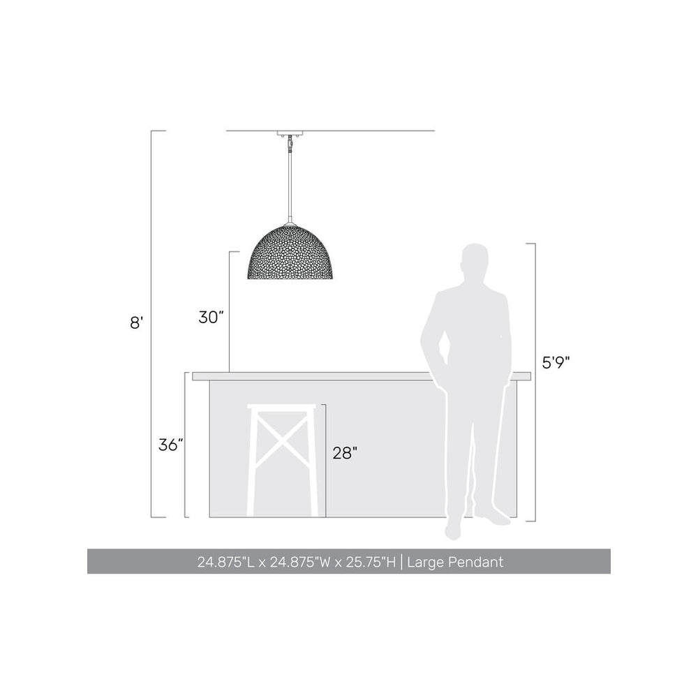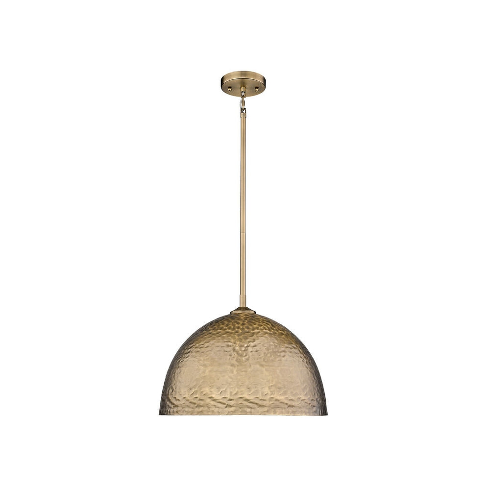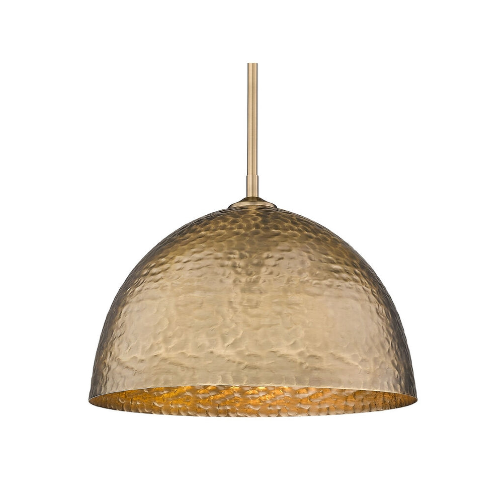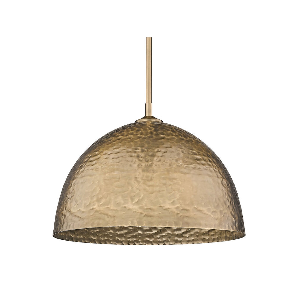 Make a modern statement with the boldly beautiful look of Shepard. Industrial-inspired and hammered to perfection, the dome metal shade is textured inside and out. A warm Modern Brass finish amplifies the contemporary look. The large shade is perfect for creating task lighting where it's needed. Hang the pendant alone over a table or in a group over a kitchen island.