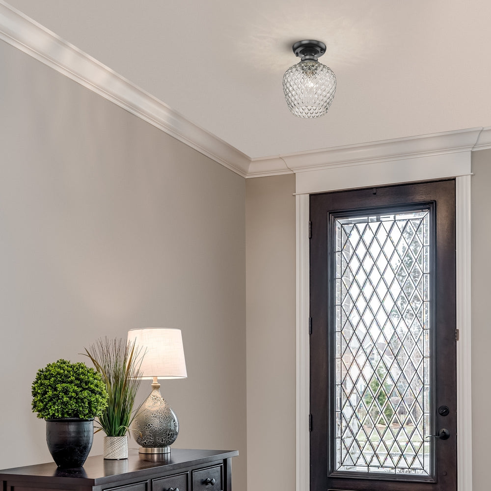 Retro with a flirty flair, Adeline is ideal for eclectic spaces. The transitional fixtures are feminine with a vintage look and organic form. The diamond-cut pattern of the clear, curved glass refracts light and adds visual interest. An open-bottom shade creates task lighting and allows for easy bulb changes.