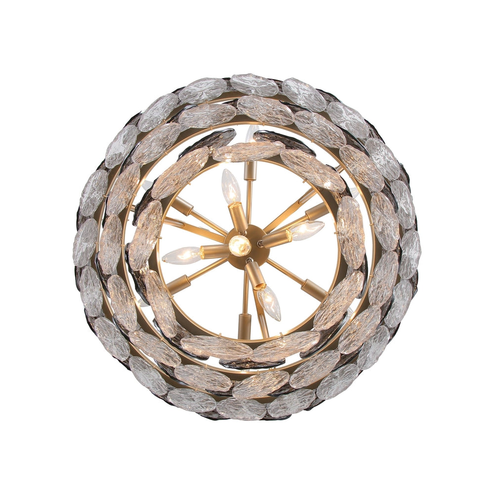 Transform your space into a haven of elegance and charm with Cascada, a breathtaking lighting fixture that captures the serene beauty of cascading water. Featuring shimmering silver tiers adorned with stunning smoke plated and clear, hammered glass circles, Cascada radiates a mesmerizing play of light and color. As the light filters through each glass disc, it creates a warm, romantic glow that envelops your room in a truly enchanting ambiance. At the heart of Cascada is Golden Lighting's signature hammered water glass, a texture that adds depth and dimension to its design. The classic empire silhouette blends timeless sophistication with modern artistry, while the fixture's intentionally concealed frame ensures that the shimmering glass remains the star of the show.