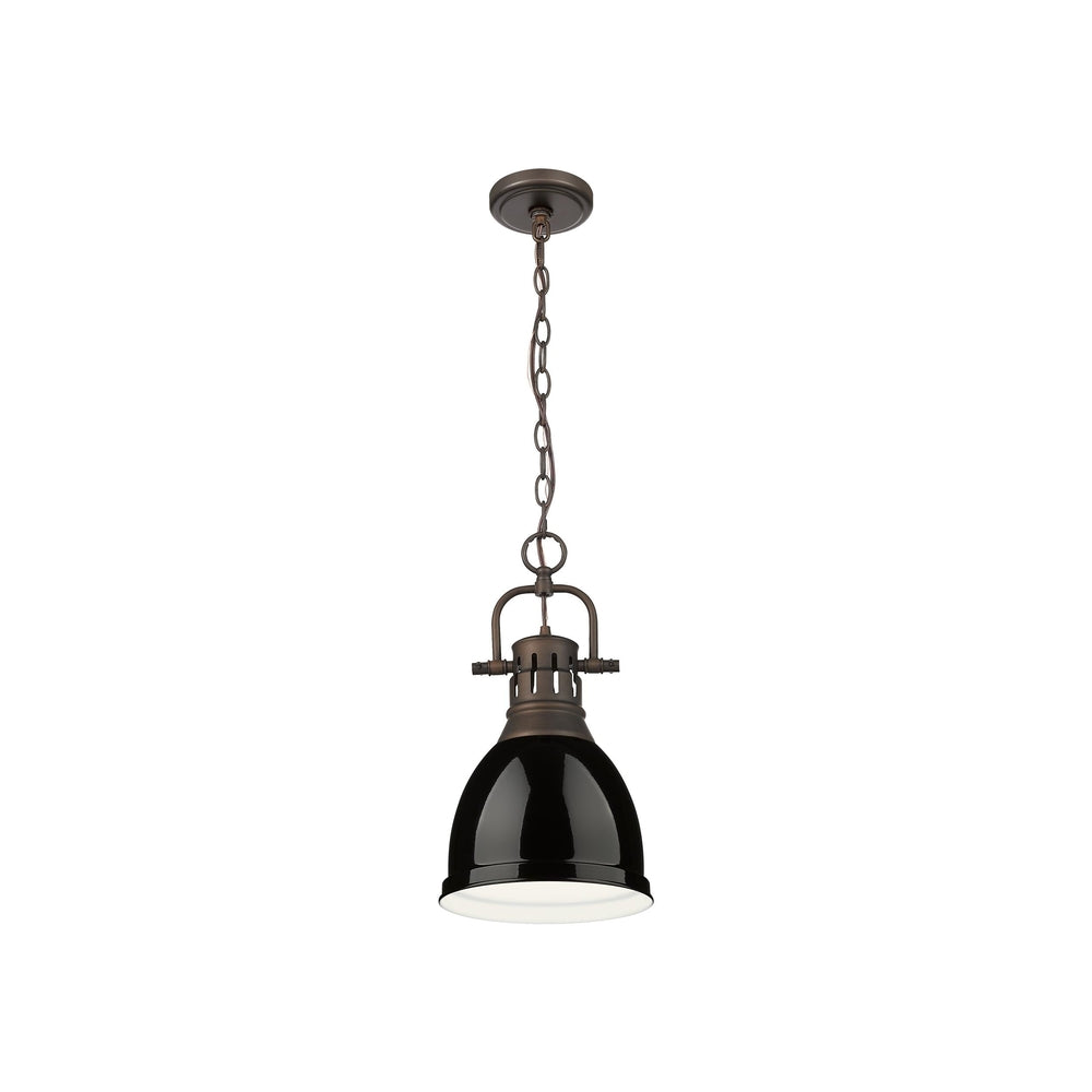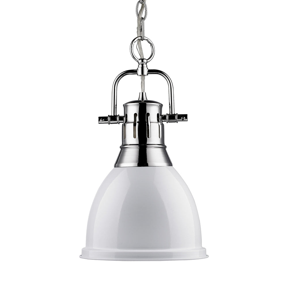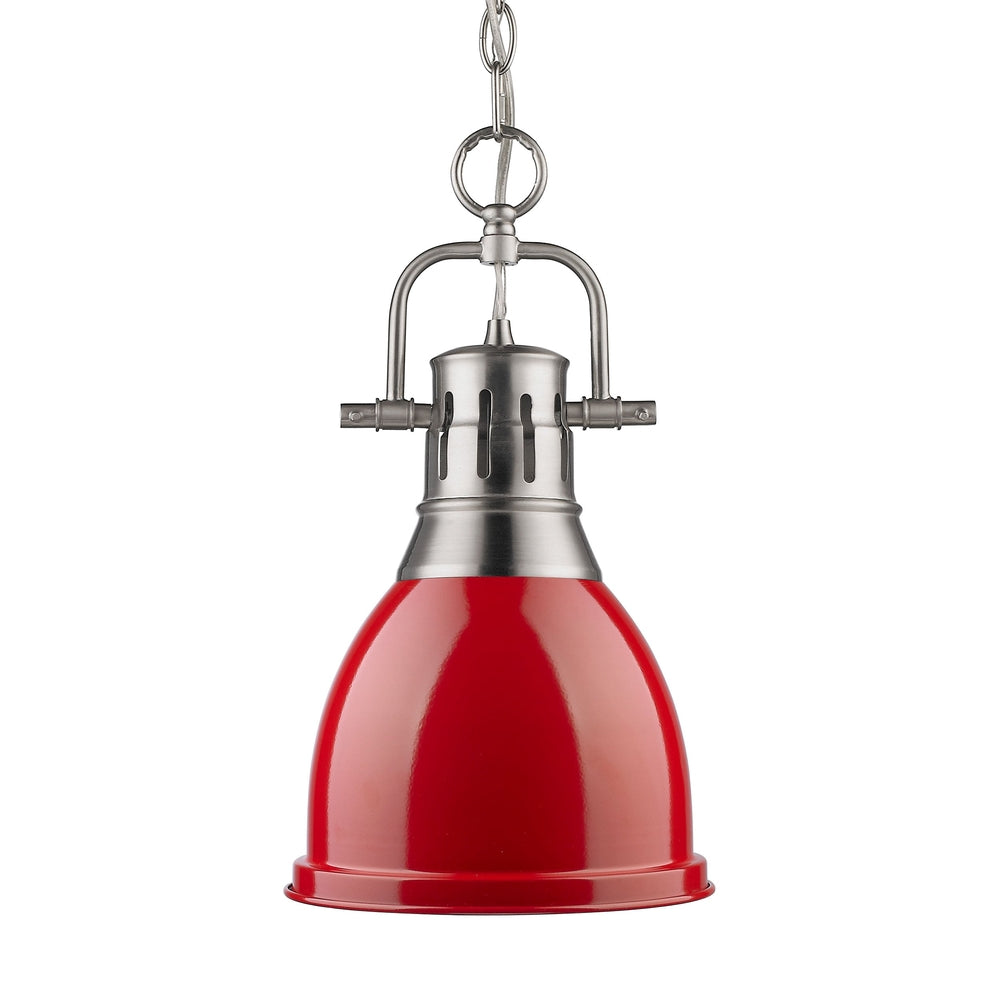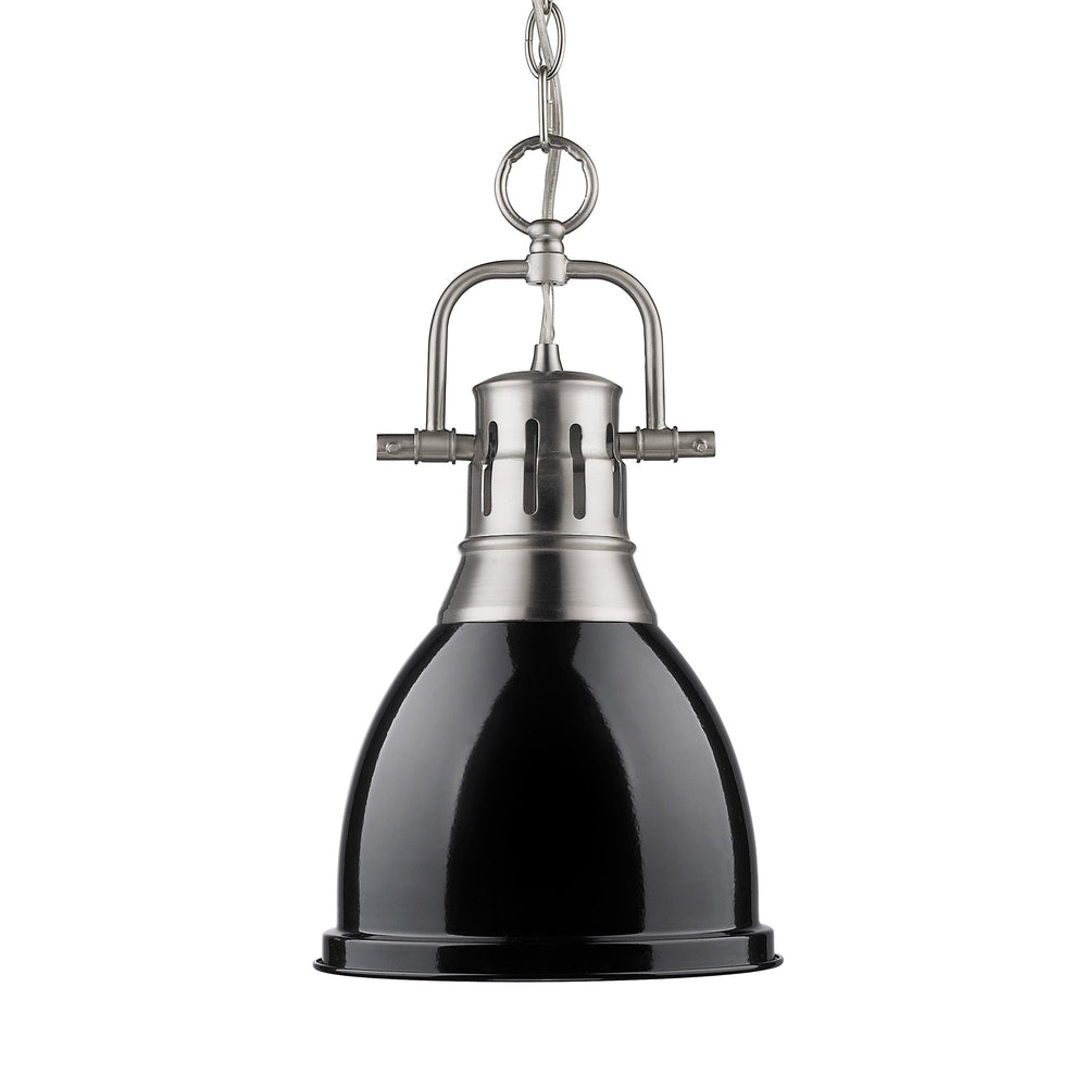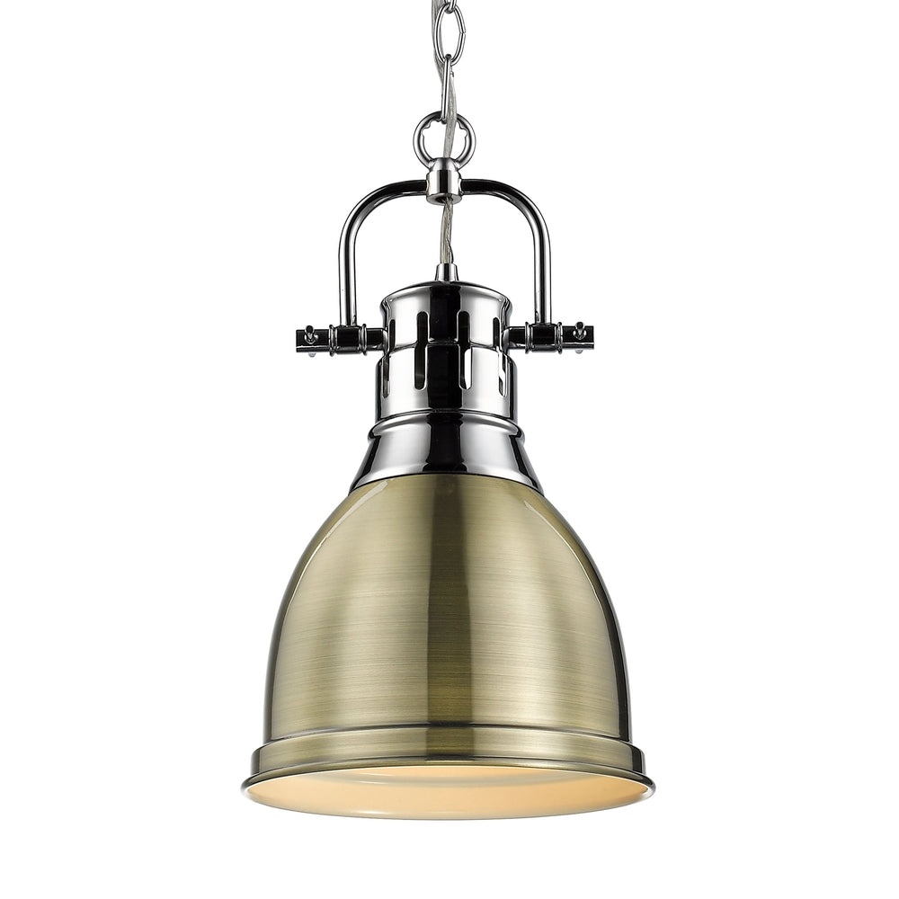 The Duncan collection is contemporary style with an industrial feel. The collection features a variety of simple, traditional silhouettes that are a nod to a bygone era. Transform the look of your room with these classic, vintage-inspired fixtures. A variety of plated and painted metal shade finishes are offered in choice combinations. This small, chain-hung pendant features a may be hung individually or grouped over a bar.