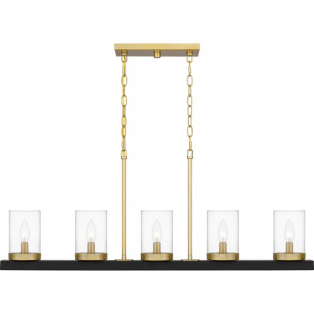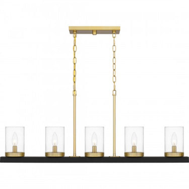 Modern glam from above. The Greeley chandelier features sculptural gold framework, clear glass candle cups and a bold, matte black ring base. This design is also available as an island light, illuminating high style in the kitchen.