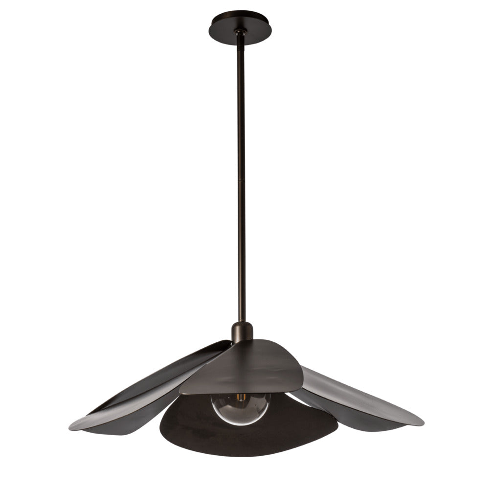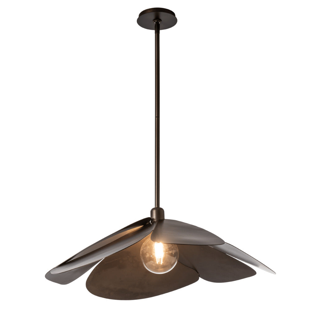 Possibly best known for its Japanese meaning "flower", Hana also means "craft" in Hawaiian and beautifully "to shine, glow, give out love or radiance" in Maori. Designed by David Kitts, this lovely, handcrafted Hana Large Pendant embodies all of that, and more. Its six, large hand-forged petals demonstrate the work of our Vermont artisans with the textured steel from the heat of the fires. Offered in any of our 11 standard finishes, or get a pop of custom color (ask us about matching any of 200+ RAL colors!).