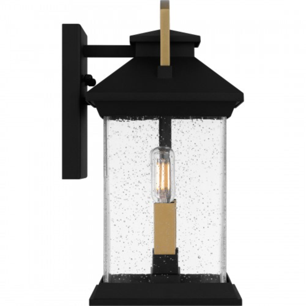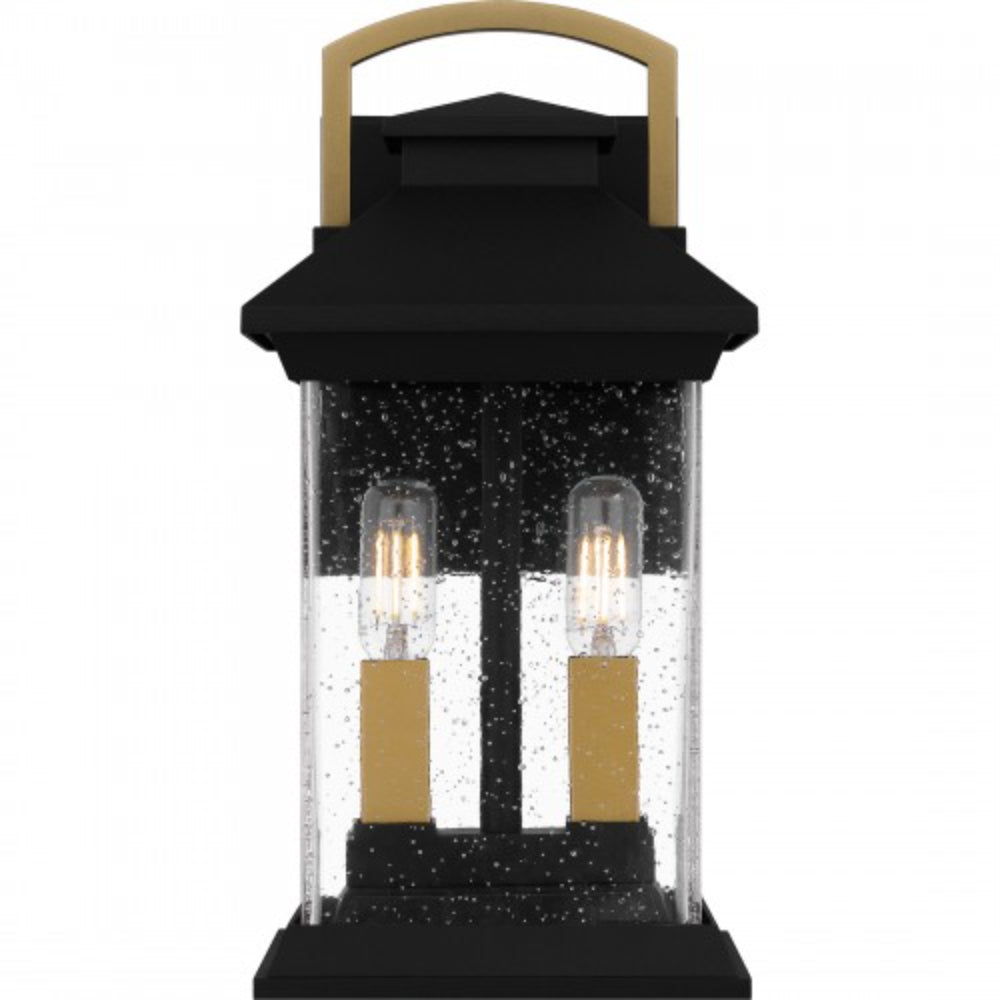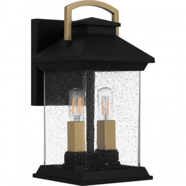 Adorn your home's exterior with Henderson outdoor wall lanterns. The rectangular silhouette is finished in earth black and features gold accents for an extra hint of modern style and luxury. Clear seedy glass shades add sparkle to the overall design, making Henderson a perfect style choice next to a front door or as a porch light.