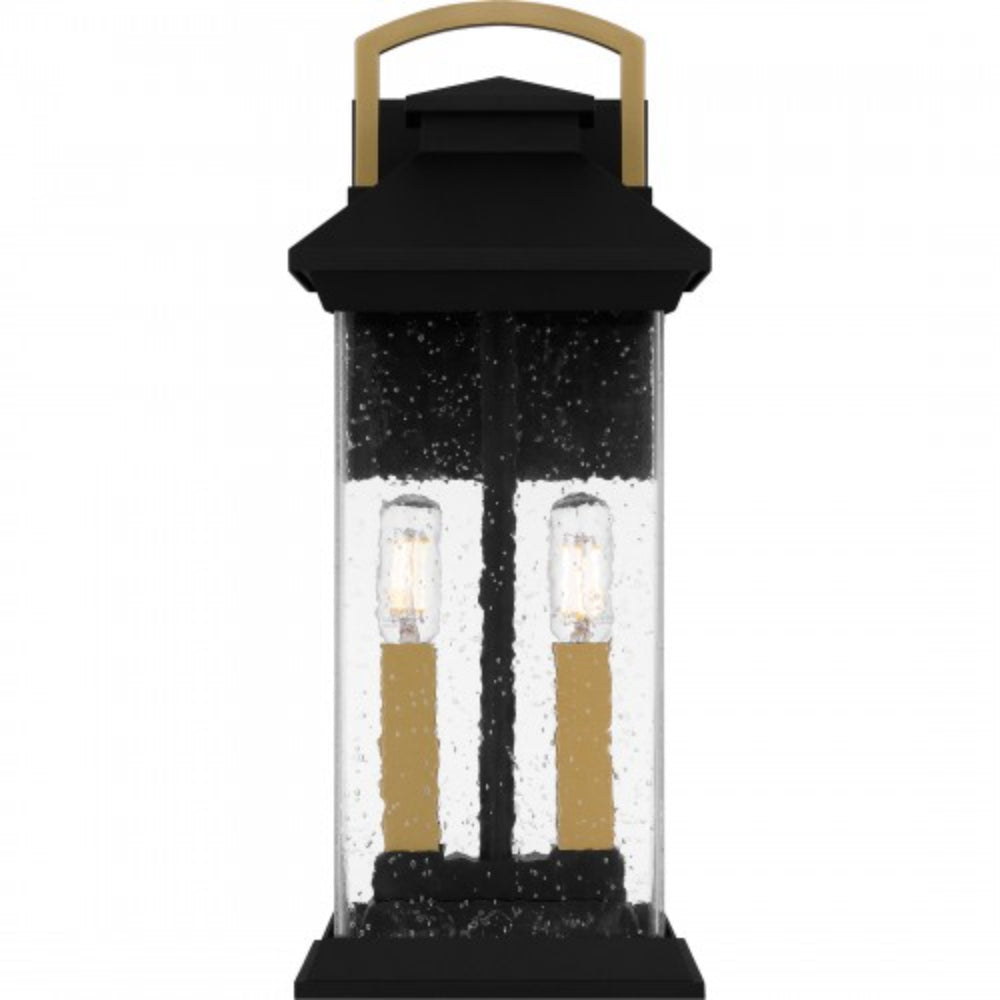 Adorn your home's exterior with Henderson outdoor wall lanterns. The rectangular silhouette is finished in earth black and features gold accents for an extra hint of modern style and luxury. Clear seedy glass shades add sparkle to the overall design, making Henderson a perfect style choice next to a front door or as a porch light.