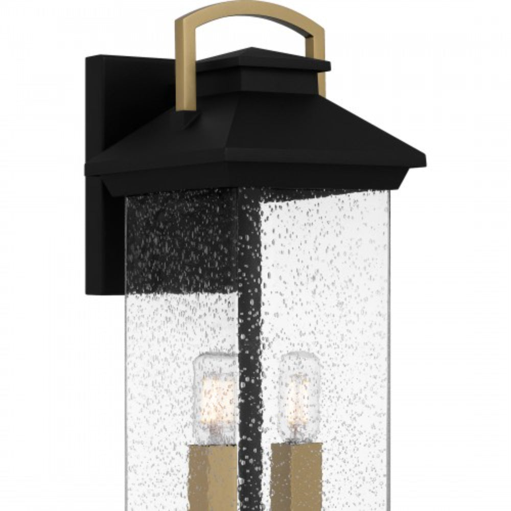 Adorn your home's exterior with Henderson outdoor wall lanterns. The rectangular silhouette is finished in earth black and features gold accents for an extra hint of modern style and luxury. Clear seedy glass shades add sparkle to the overall design, making Henderson a perfect style choice next to a front door or as a porch light.