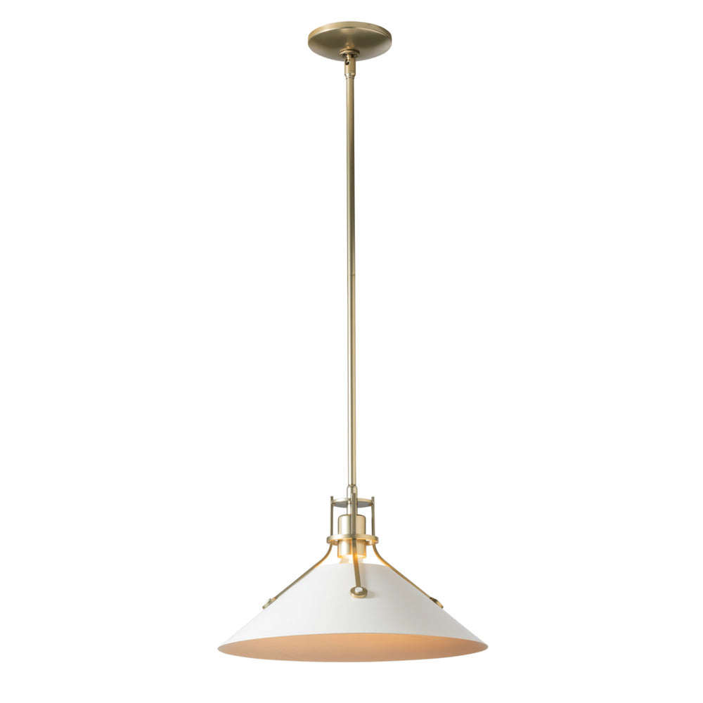 The iconic Henry Collection with its conical shades held by riveted metal arms adds a medium sized version to its offering of indoor pendants. This Henry offers a steel shade and is available as a two-tone fixture with the option of a contrasting shade color. Available in all standard finishes.