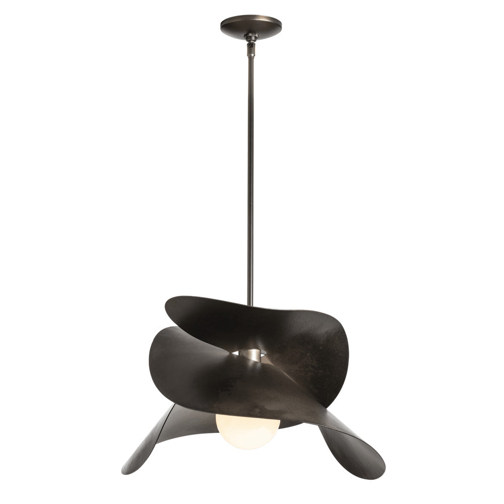 The Hibiscus Pendant's metal "petals" feature Hubbardton Forge's hallmark textures from the fires of the forge. The Hibiscus Large version, over 2 ft in width, sheds ample light and makes a bold statement in any space. Also available in a smaller version, as well as an outdoor pendant option.