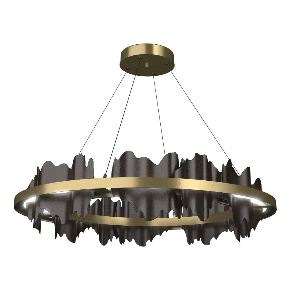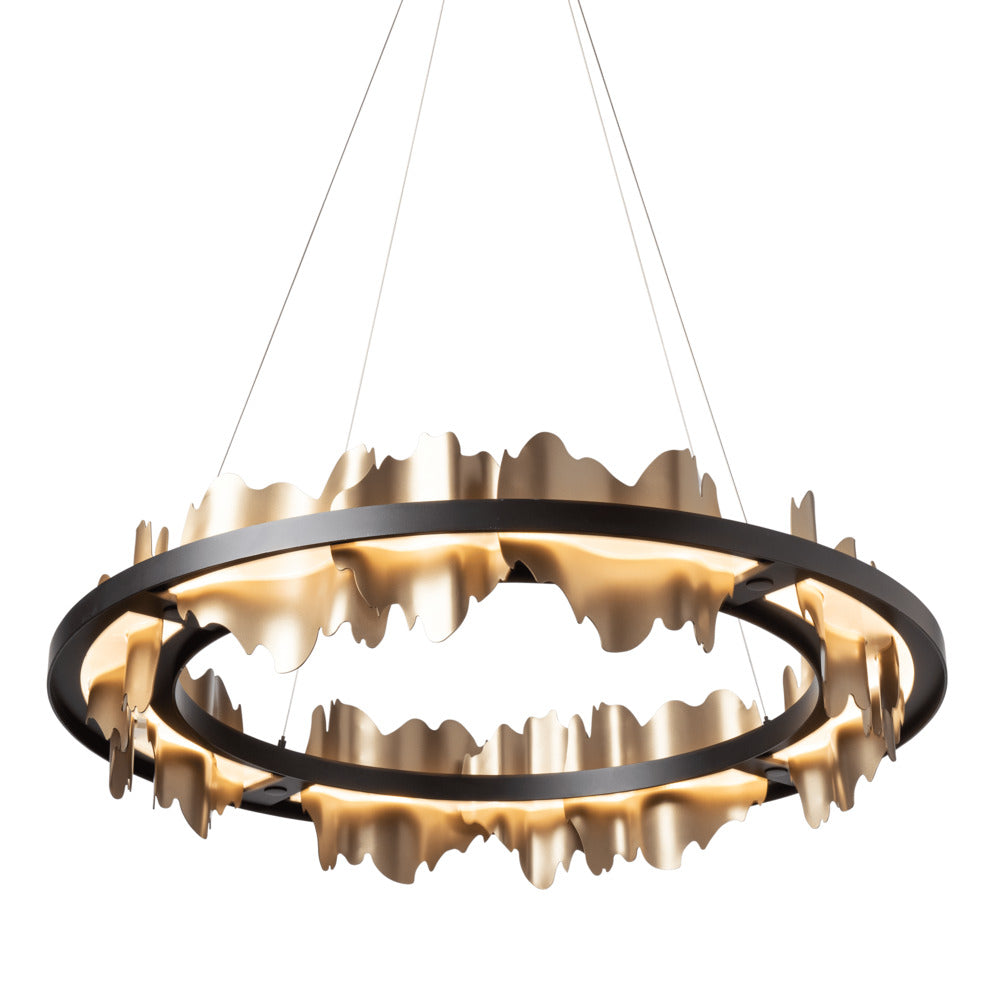 This magnificent and dramatic Hildene Circular pendant, with its crafted hills and valleys creating shadow and light, is a focal piece in any space. Part of the Hildene Collection, this large pendant's curved metal plates are awash in up-and-down light emanating from the LED lightguide encased in its circular frame. The Hildene is offered with a two-toned finish option, with the canopy and frame in one finish, and the metal plates in a choice of accent colors. Also available as a linear cable-hung pendant, a large linear rod-hung pendant, and a wall sconce.