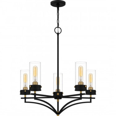Hillside spotlights modern industrial style. Thin matte black arms are accentuated by clear glass shades and warm brass accents, adding a striking contrast to the clean lines and geometric silhouette. The Hillside chandelier is available in two sizes to easily coordinate with a variety of home decor styles.