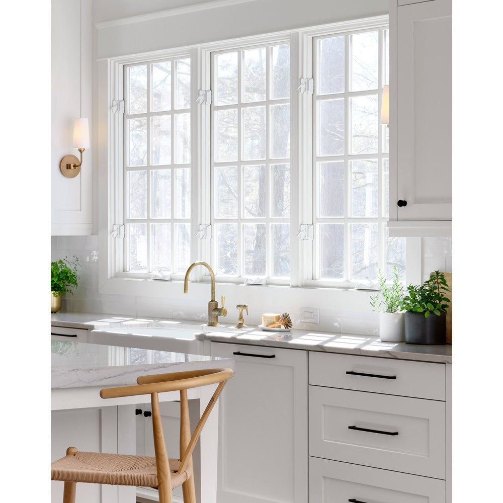 Lewis offers traditional charm paired with updated, transitional elements. Tall natural paper shades feature fine stitching detail against a Heritage Brass or Black Oxide finish to enhance timeless interiors.