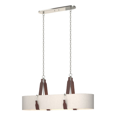 Chain-hung linear pendant with an oval shade supported by hand-crafted leather accents. Please note that natural color variations will occur with genuine leather. Characteristics will differ from hide to hide with how each hide absorbs the dye.