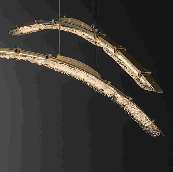If you thought the Glissade Large Pendant was beautiful, how would you describe the Double? With crisscrossing, large, hand-poured, curved glass elements, the Glissade Double Large LED Pendant is just stunning. The heavily-fritted surfaces of the glass gives an organic feel to the contemporary style of this chandelier. Form and function combine with this Glissade to make it well-suited to a variety of interior applications.