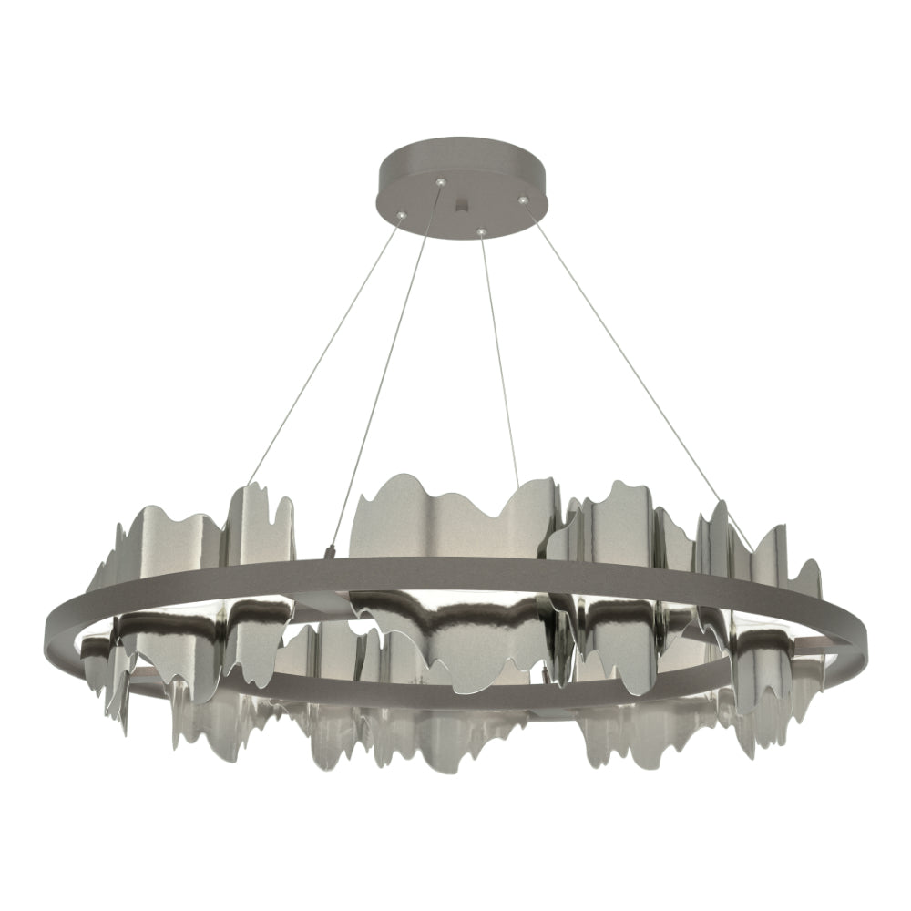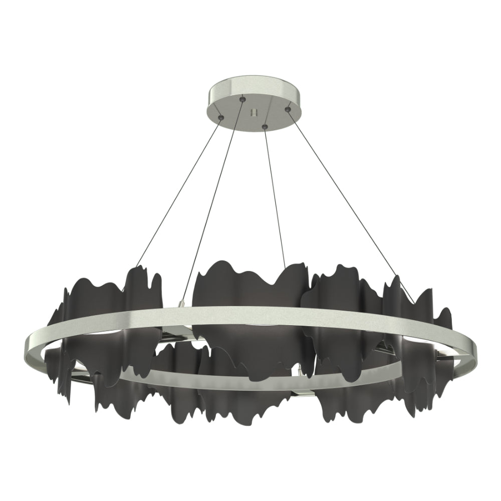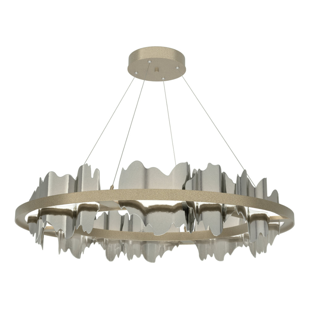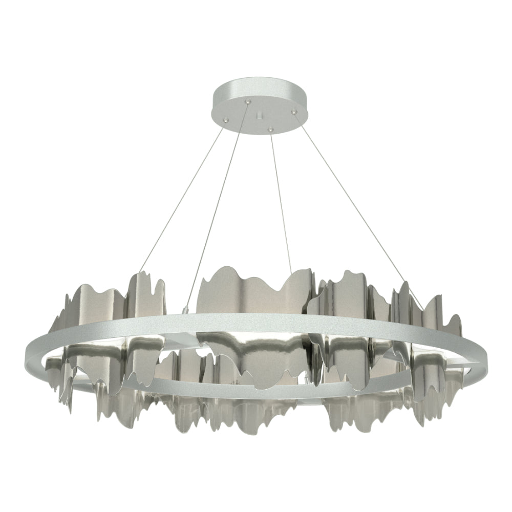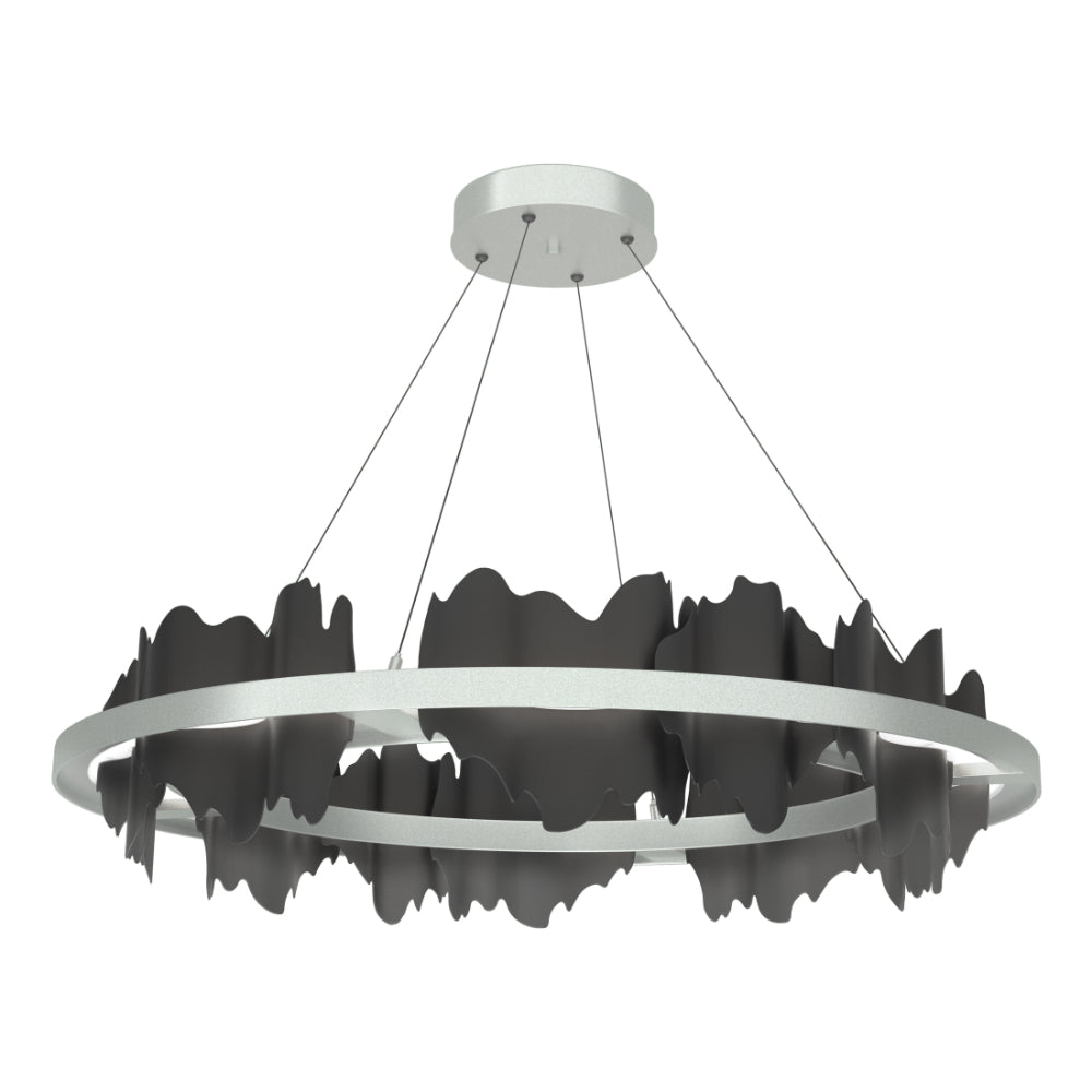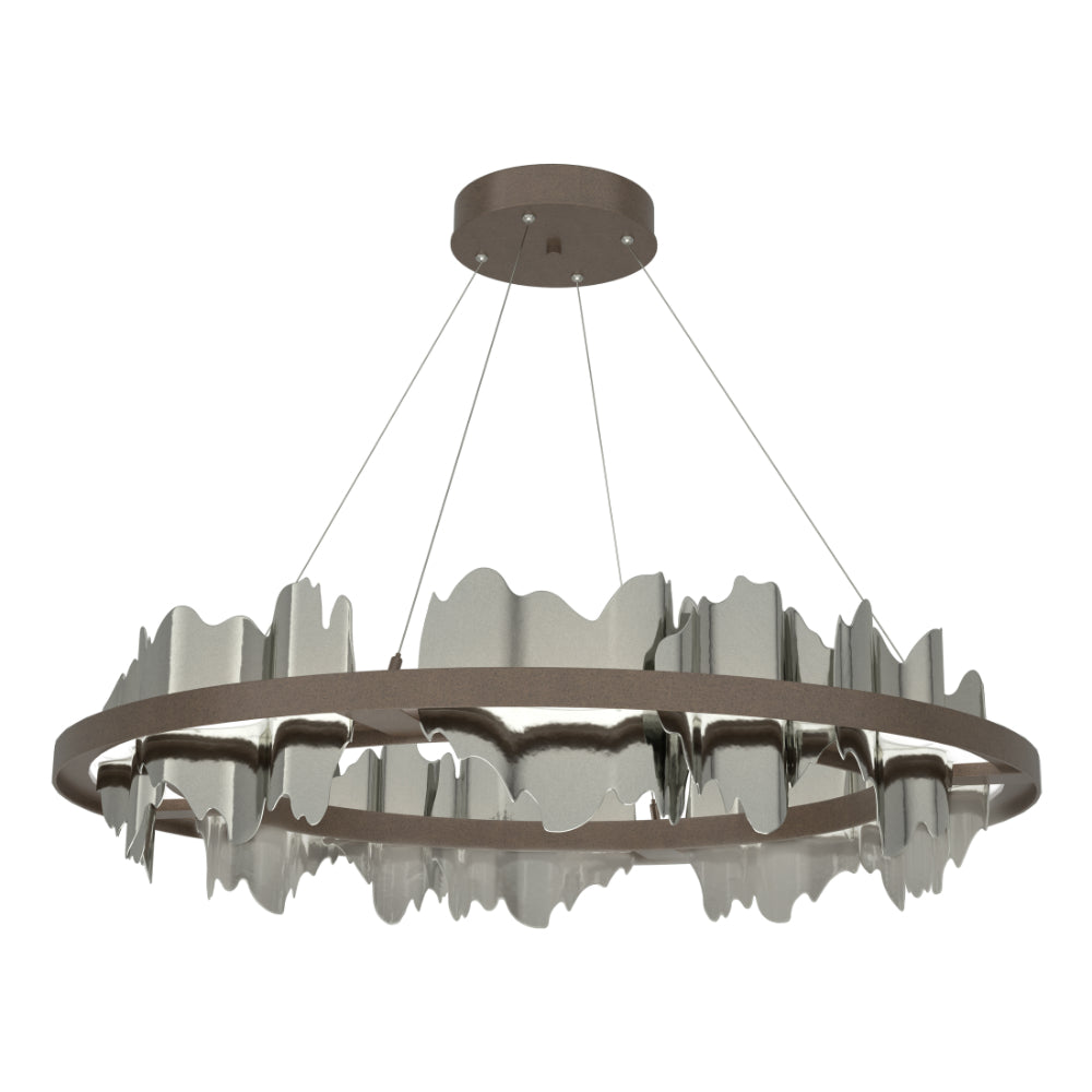 Height adjustable circular LED pendant. Choose a finish for the canopy and fixture frame and an accent for the decorative bent metal plates.