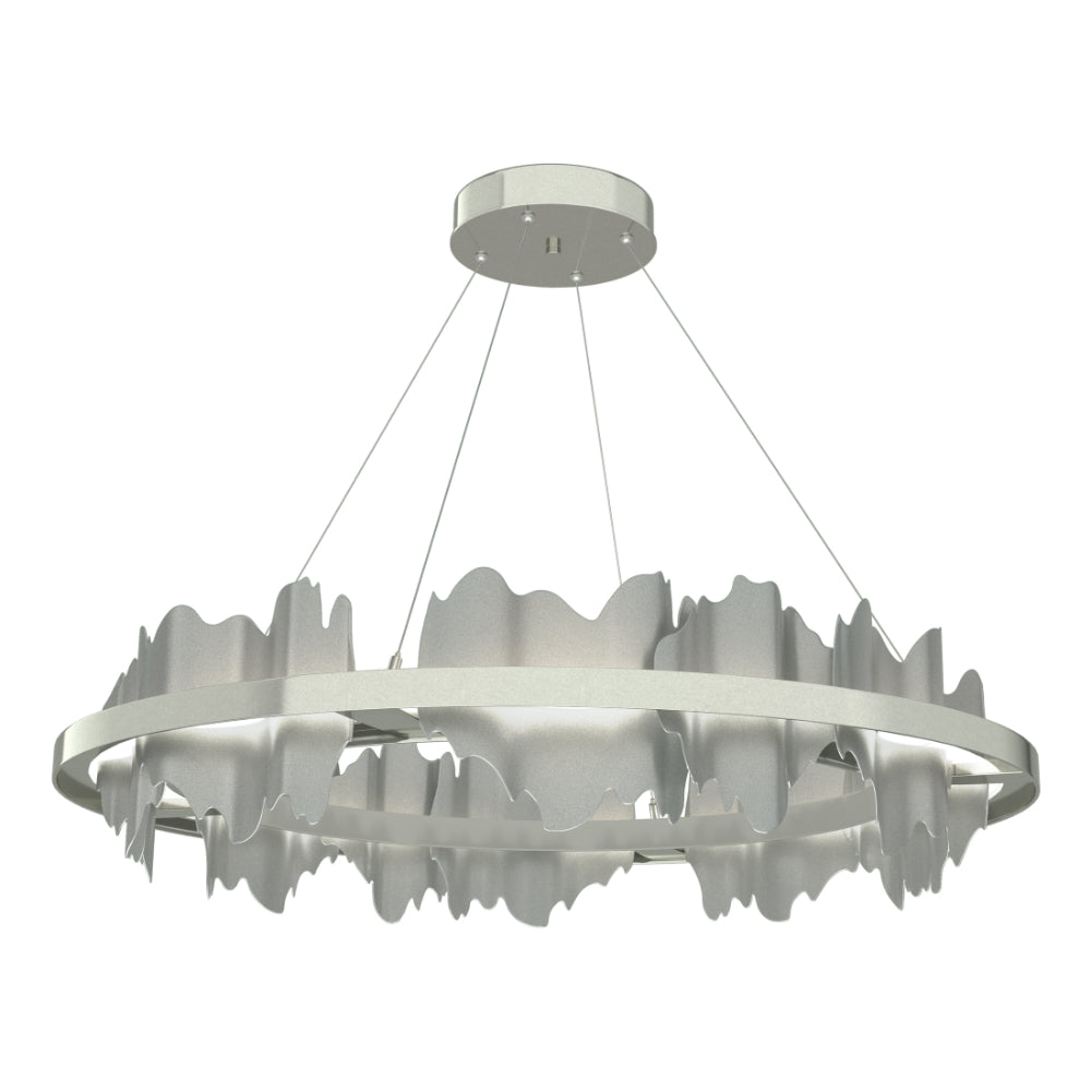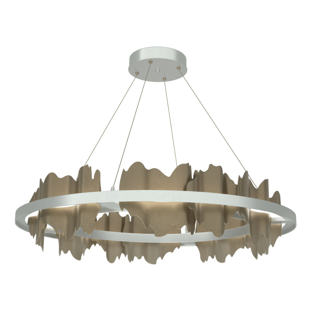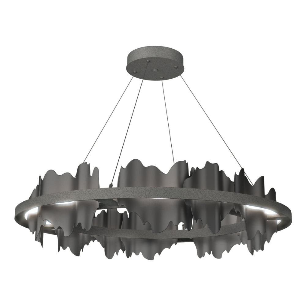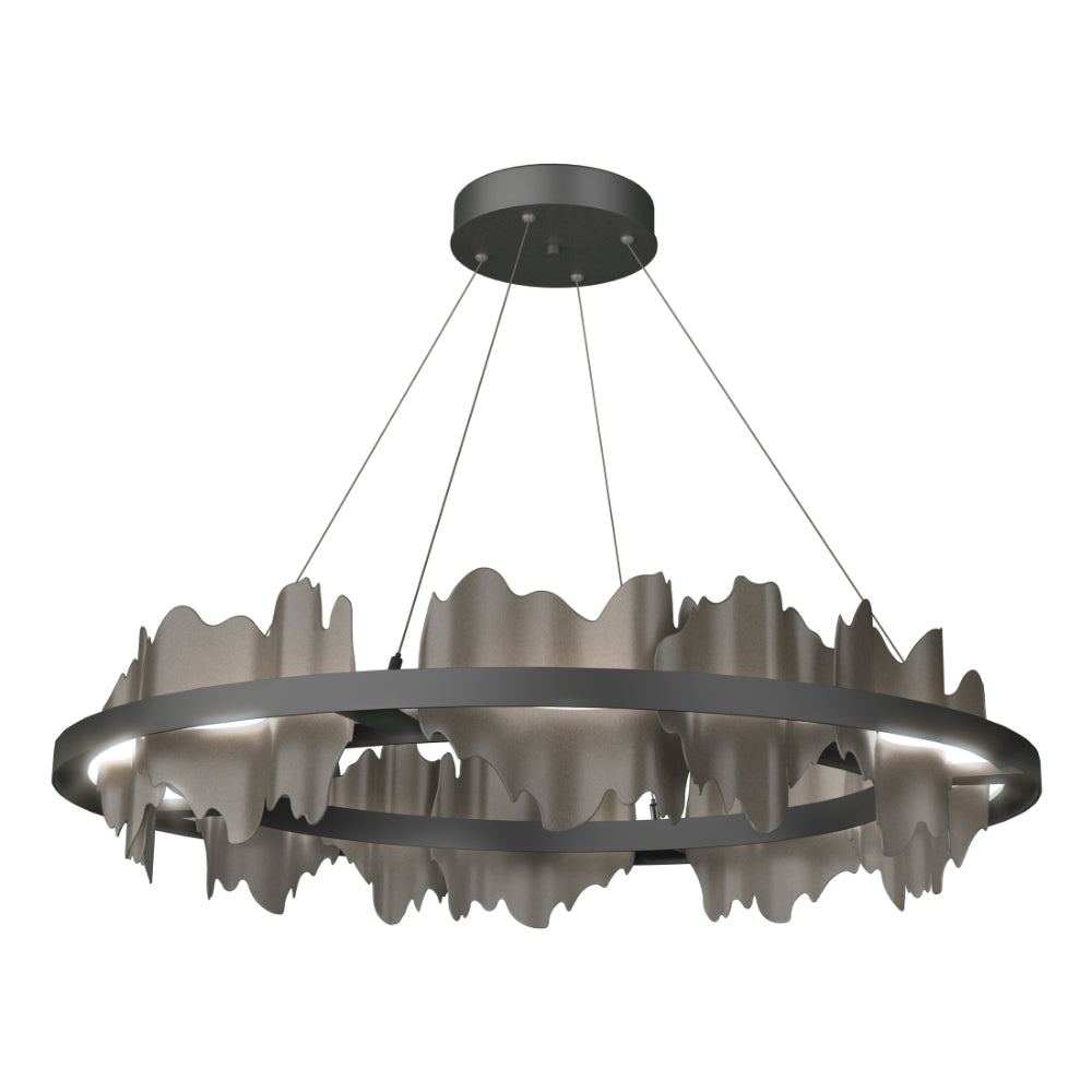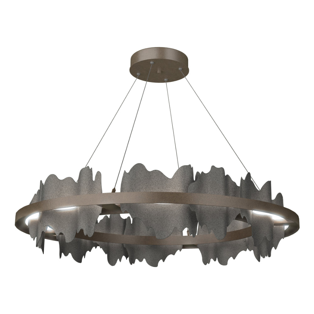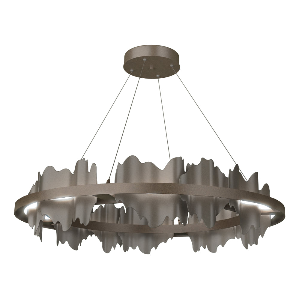 Height adjustable circular LED pendant. Choose a finish for the canopy and fixture frame and an accent for the decorative bent metal plates.