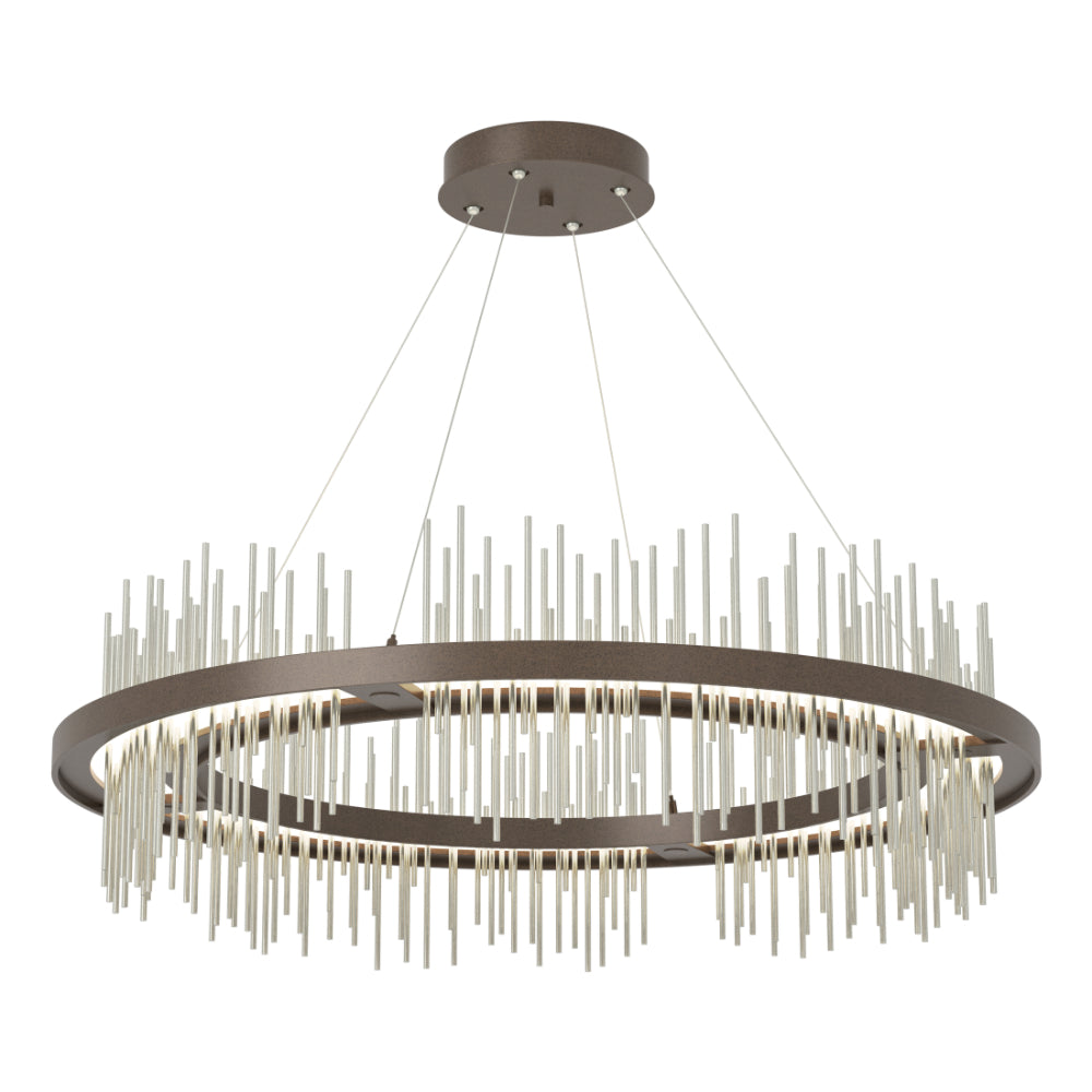 Height adjustable cable-hung circular LED pendant. Choose a finish for the canopy and the fixture frame and an accent for the decorative rods.